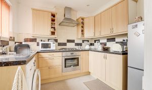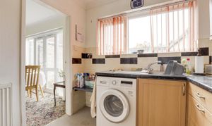 Dimensions: 2.71m x 2.39m (8'10" x 7'10"). The kitchen has a range of fitted base and wall units with worktops, stainless steel sink with a mixer tap and drainer, an integrated oven, gas ring hob and extractor hood, space for a fridge freezer, space and plumbing for a washing machine, coving to the ceiling, recessed spotlights, a radiator, tiled splashback, vinyl flooring, and a UPVC double glazed window to the rear elevation.