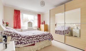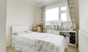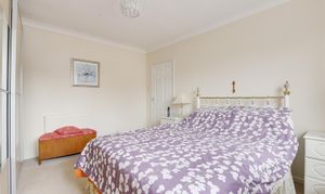 Dimensions: 2.75m x 2.42m (9'0" x 7'11"). The second bedroom has a UPVC double glazed window to the front elevation, a radiator, coving to the ceiling, and carpeted flooring.
