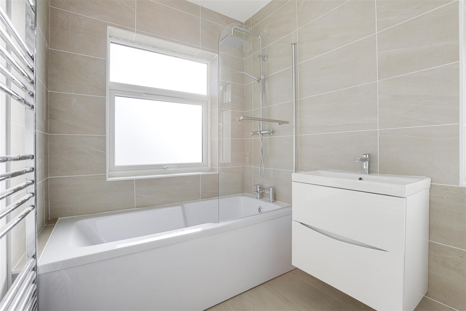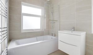 Dimensions: 2.34m x 1.78m (7'8" x 5'10"). The bathroom has a low level dual flush W/C, a vanity storage unit with a wash basin, a panelled bath with an overhead rainfall shower with a handheld shower head, a heated towel rail, partially tiled walls, recessed spotlights, an extractor fan, tiled walls and two UPVC double-glazed windows to the rear and side elevations.