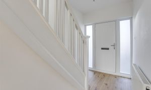 Dimensions: 4.01m x 1.80m (13'2" x 5'11"). The entrance hall has laminate wood-effect flooring, carpeted stairs, a radiator, an under-stairs cupboard, two full-height UPVC double-glazed obscure windows to the front elevation and a single composite door providing access into the accommodation.