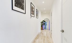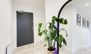 Dimensions: 5.11 x 3.00 (16'9" x 9'10"). The entrance hall has wood-effect flooring, a radiator, a built-in storage cupboard, recessed spotlights, and a single door providing access into the accommodation.
