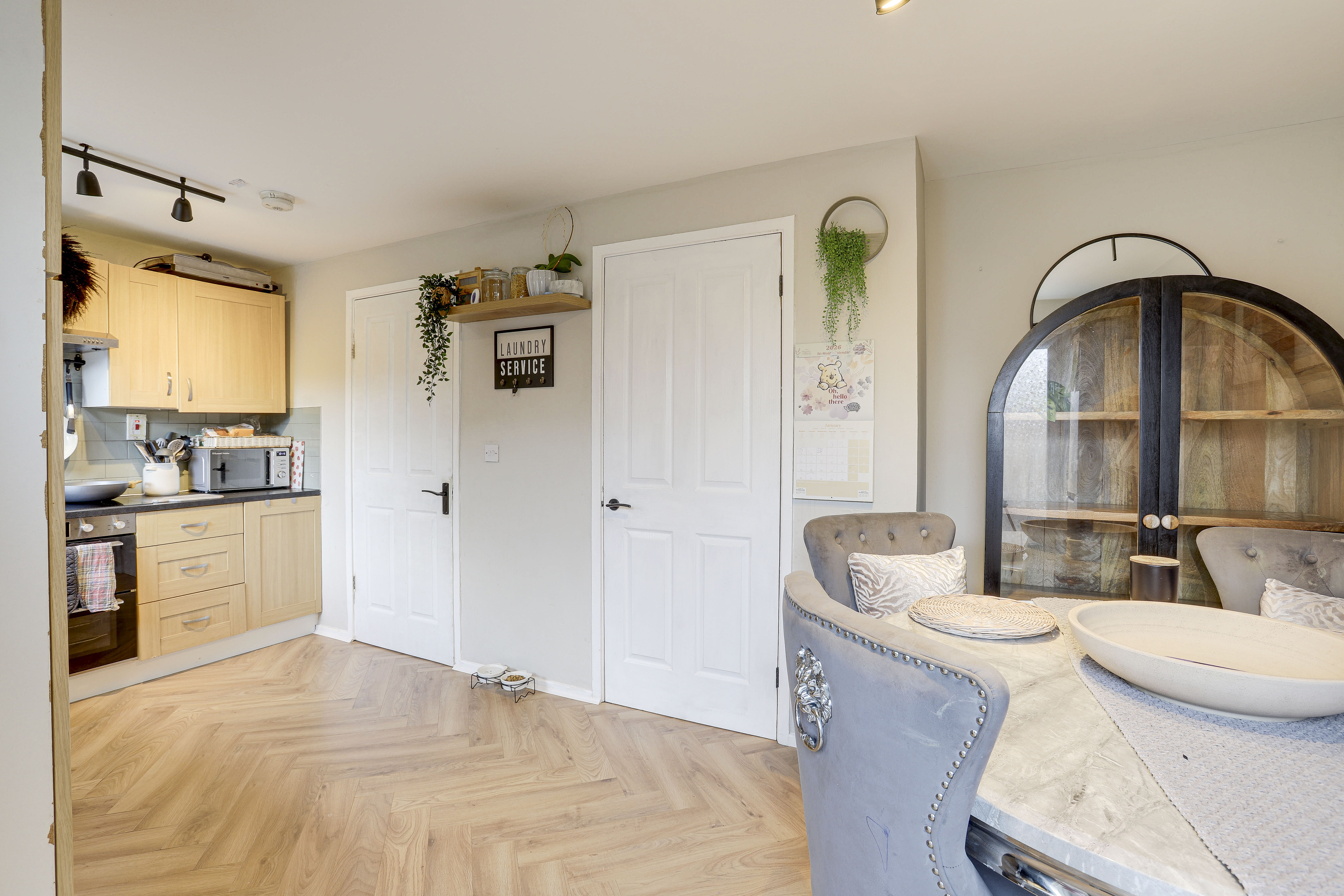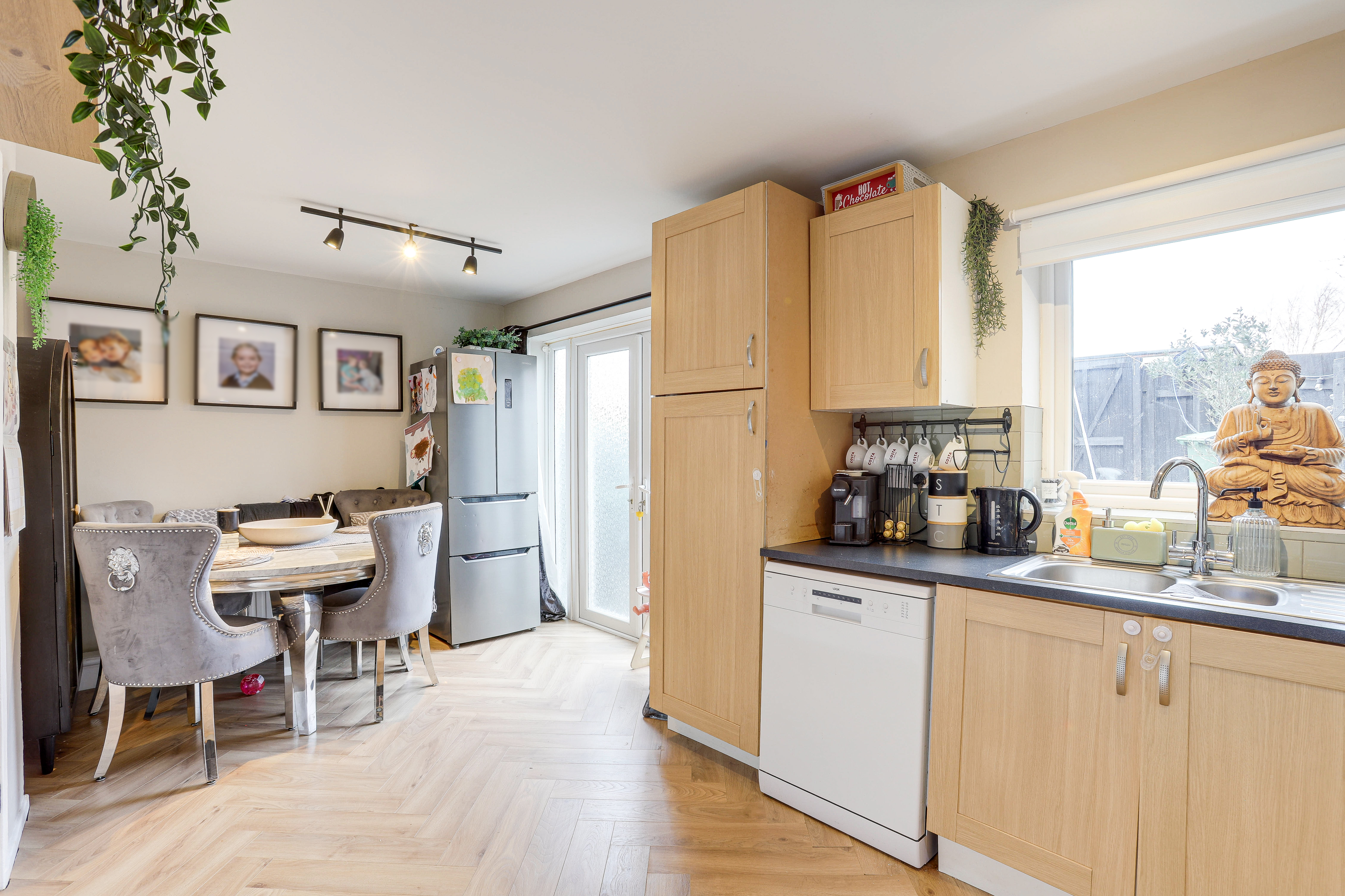 The kitchen has a range of fitted shaker style base and wall units with worktops and a tiled splashback, an integrated oven, a hob with an extractor hood, a stainless steel sink and a half with a drainer and a swan neck mixer tap, space and plumbing for a washing machine, space for a fridge-freezer, space for a dining table, a built-in cupboard, herringbone style flooring, a radiator, a UPVC double-glazed window to the rear elevation and UPVC double French doors providing access out to the garden.