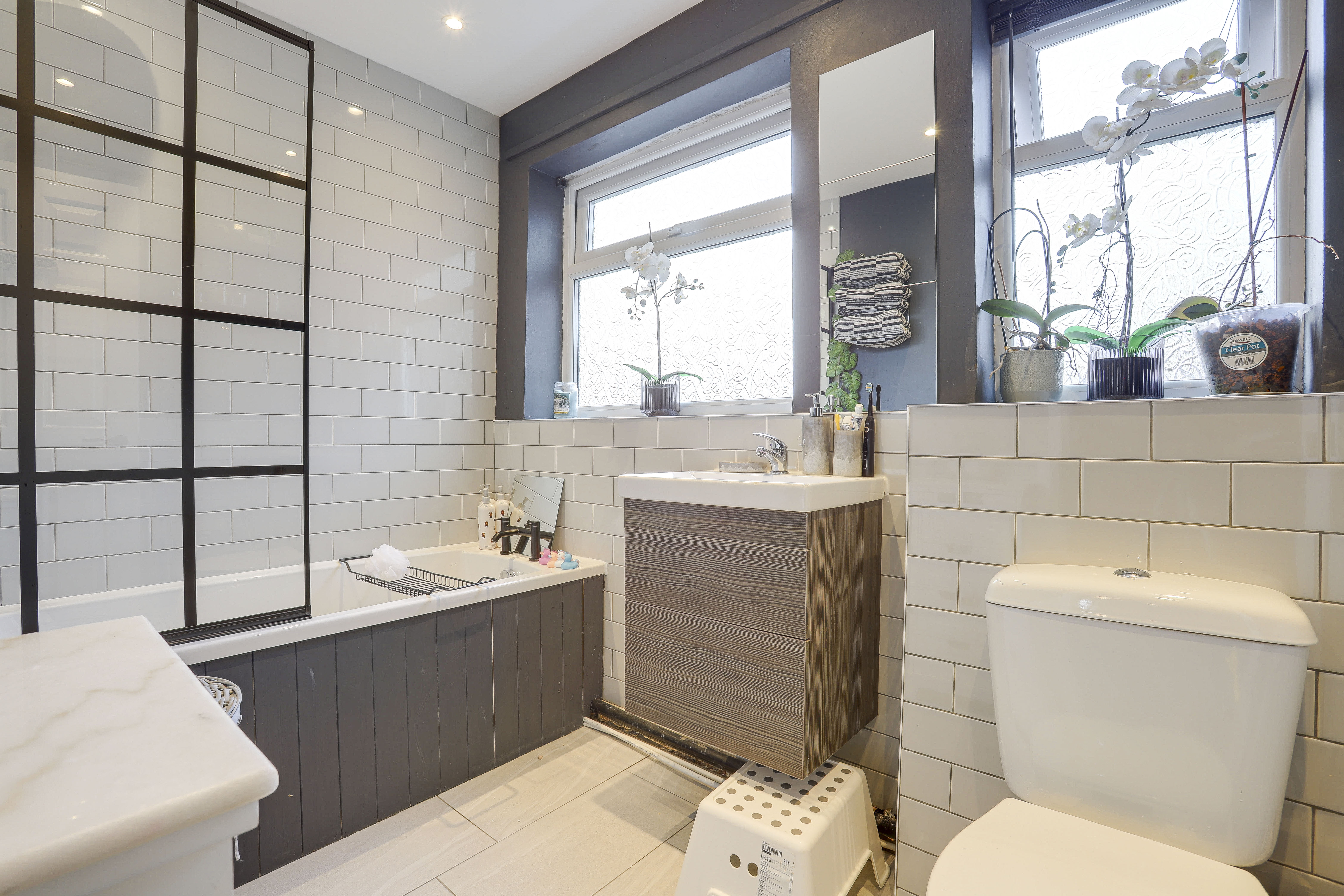 The bathroom has a low level flush W/C, a wall-mounted vanity style wash basin, a fitted bath with a mains-fed over the head rainfall shower, a hand-held shower and glass shower screen, tiled flooring, partially tiled walls, a heated towel rail, recessed spotlights and UPVC double-glazed obscure windows to the rear elevations