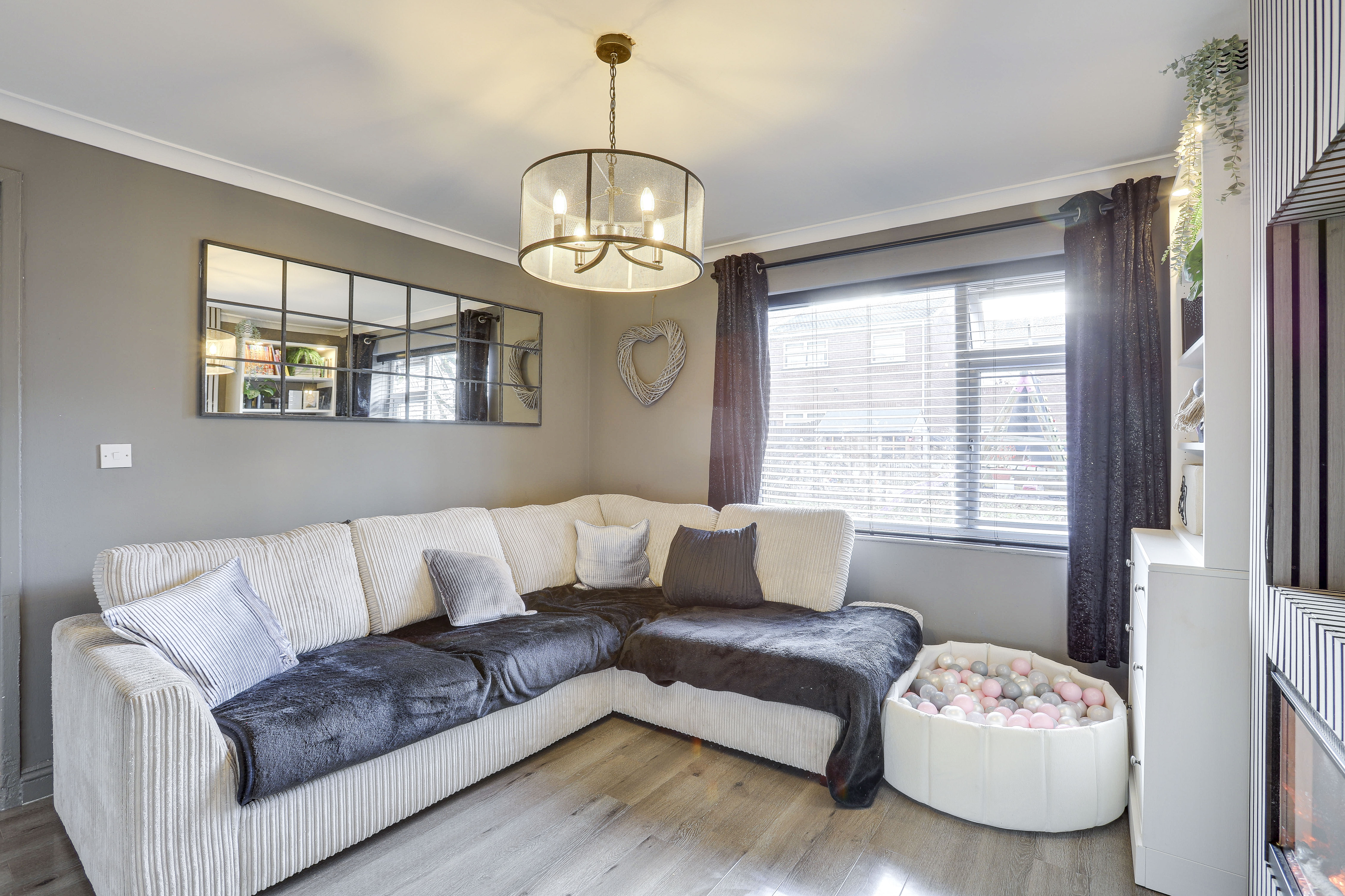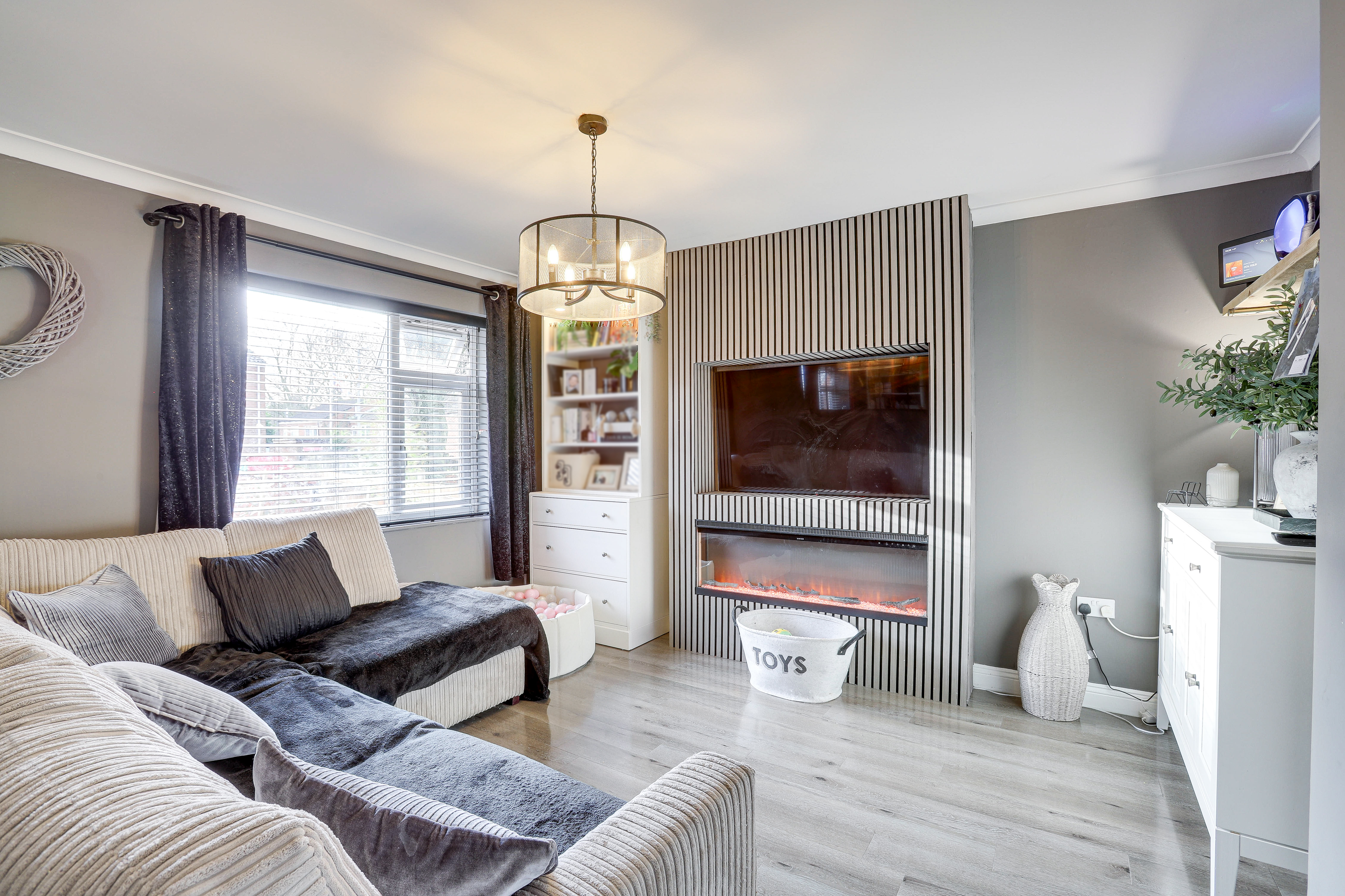 The living room has a UPVC double-glazed window to the front elevation, wood-effect flooring, a radiator, a media wall with an inset electric flame-effect fireplace and coving.