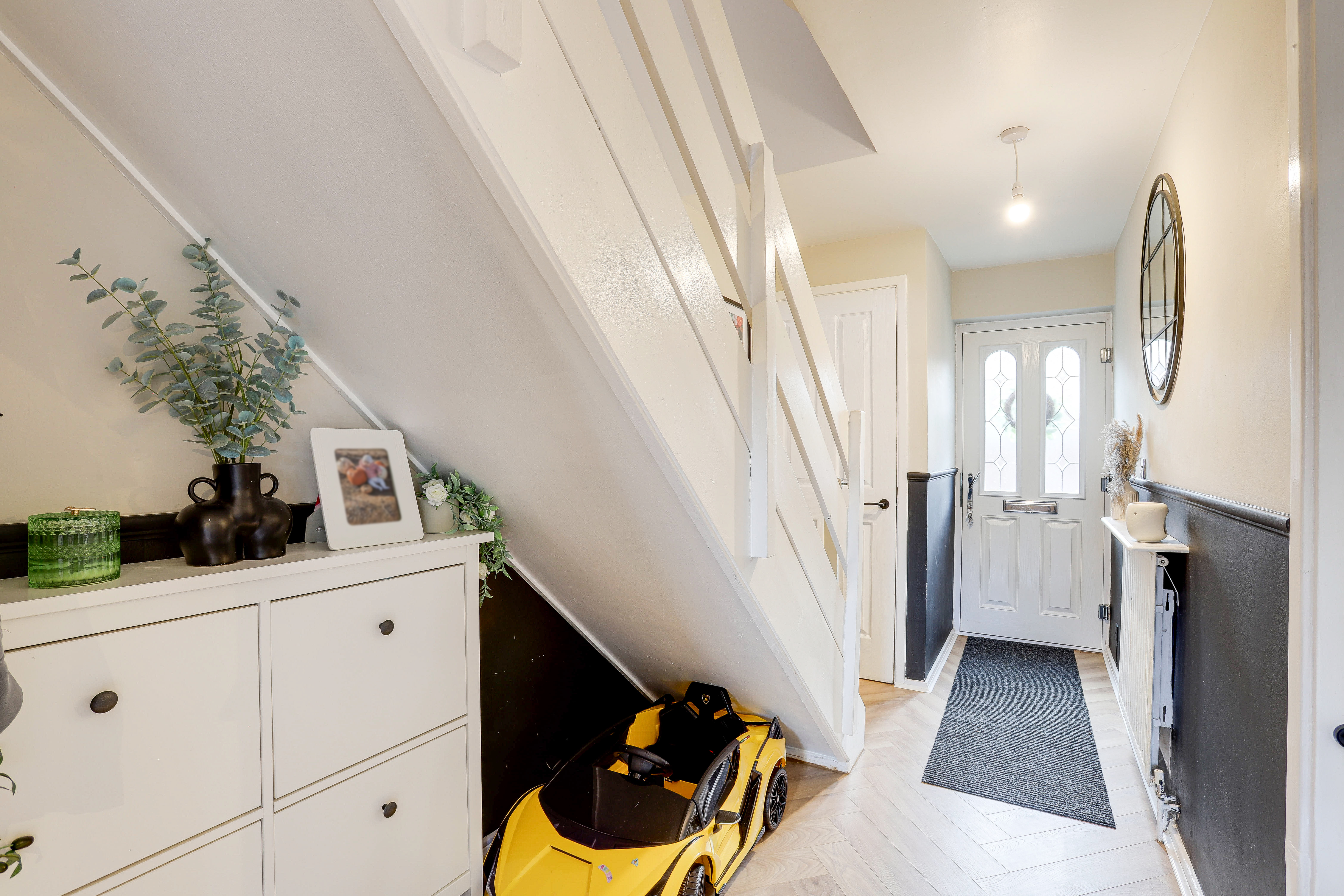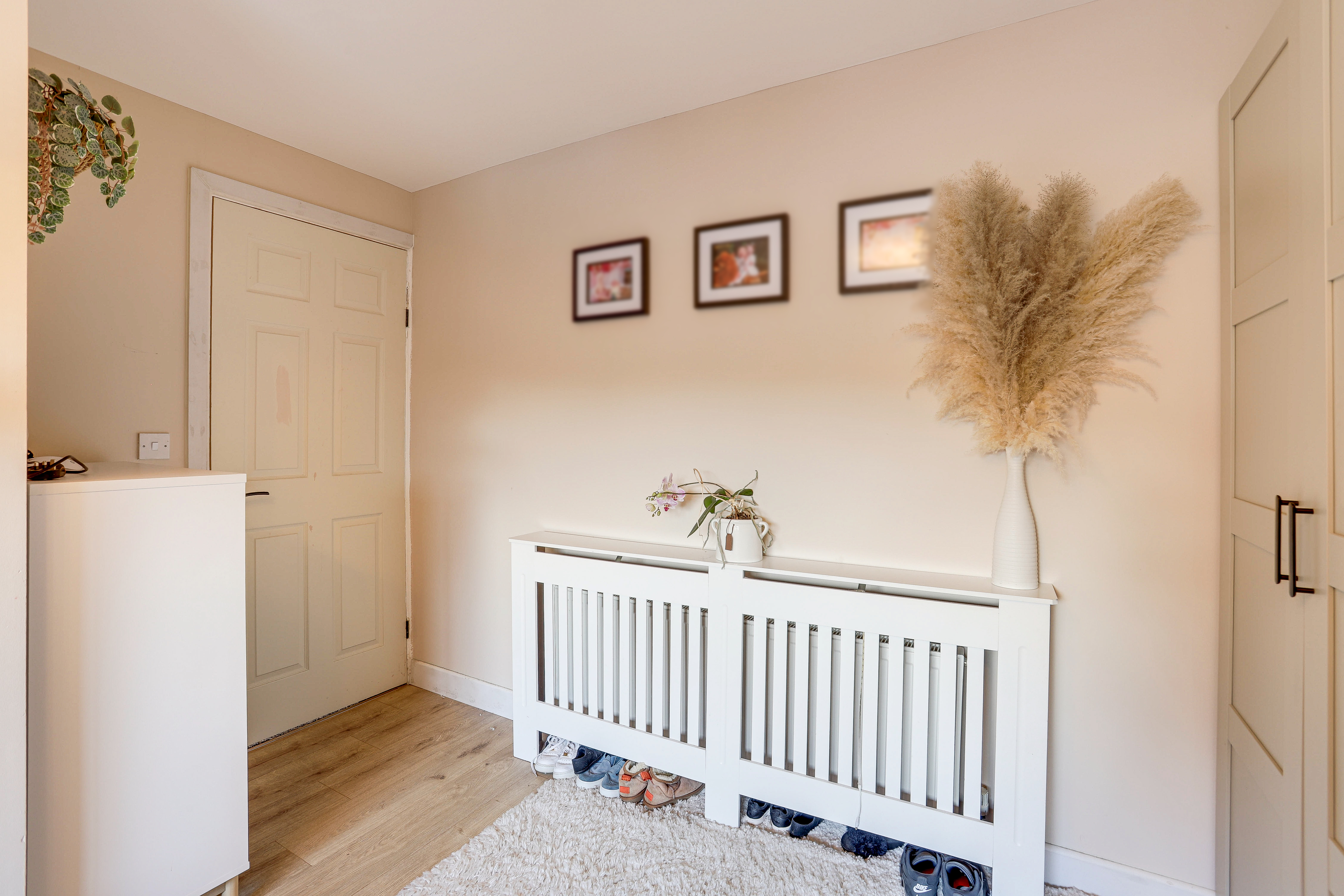 The entrance hall has herringbone style flooring, a radiator, carpeted stairs, two built-in cupboards, a dado rail and a single composite door providing access into the accommodation.
