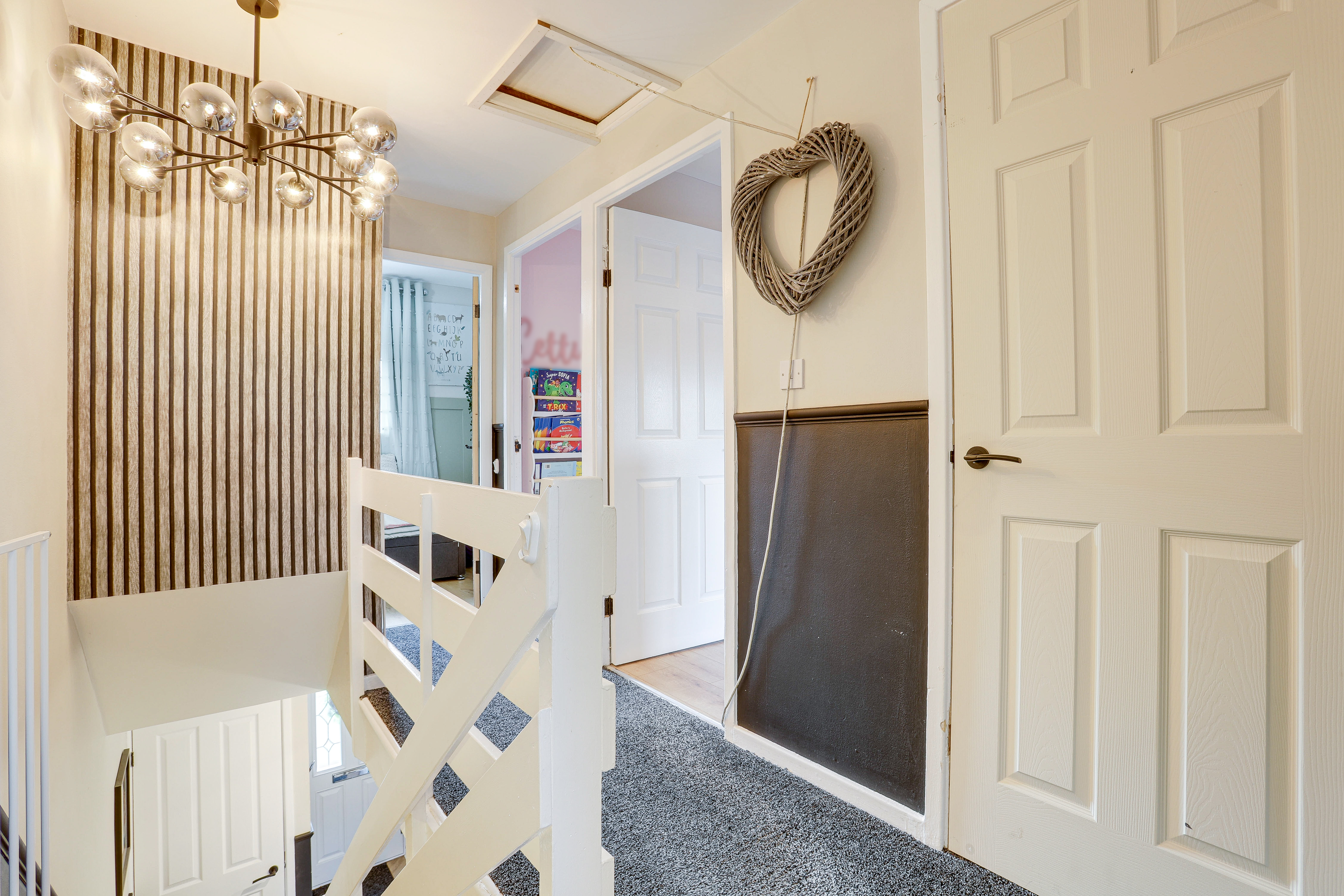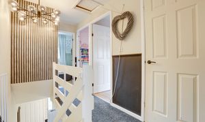 The landing has carpeted flooring, two built-in cupboards, a dado rail, access into the loft and provides access to the first floor accommodation.