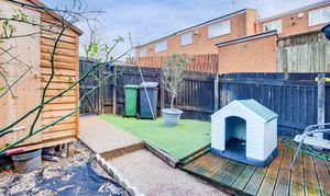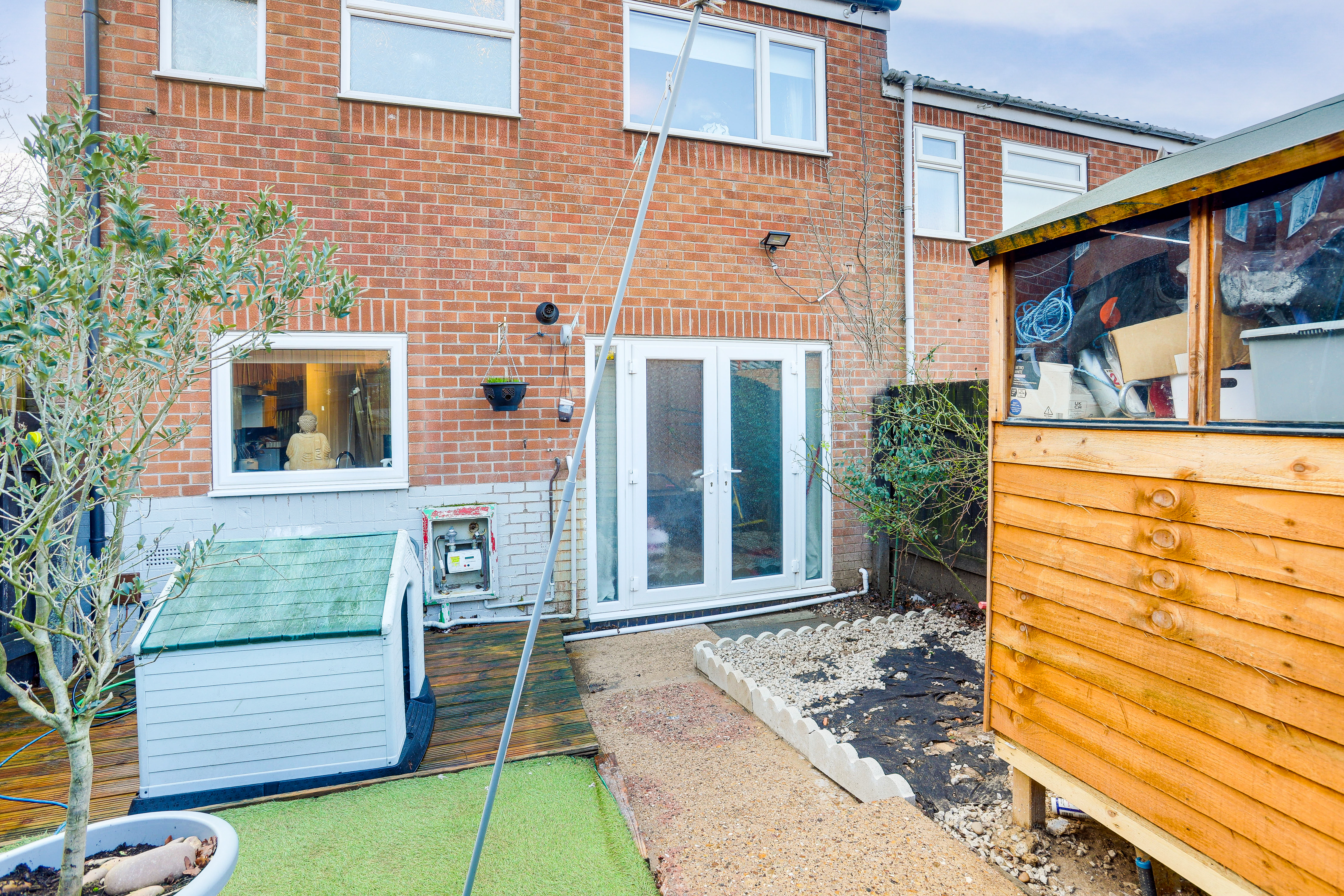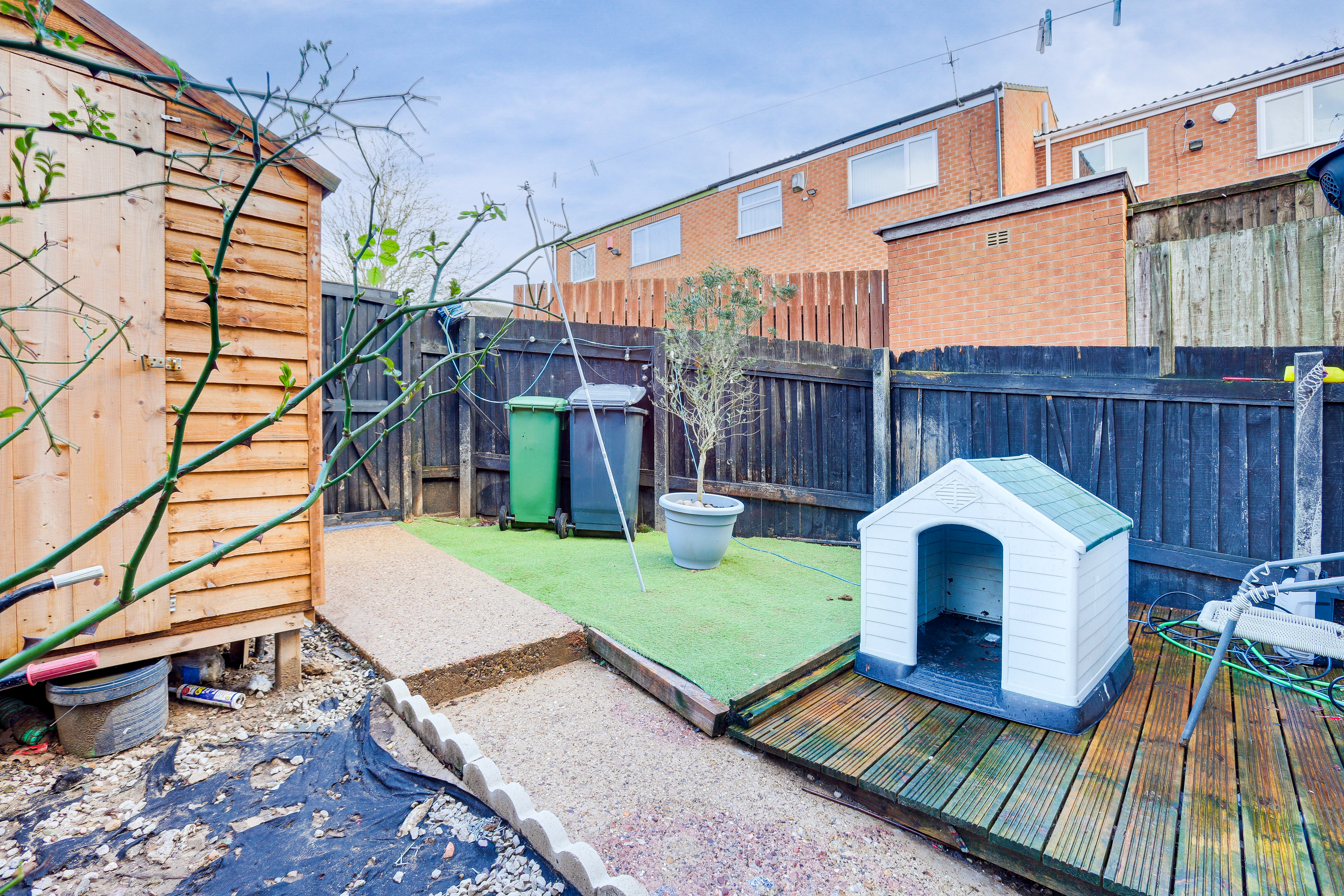 To the rear is a private garden featuring a decked wooden seating area, an artificial lawn, a shed and fence-panelled boundaries.