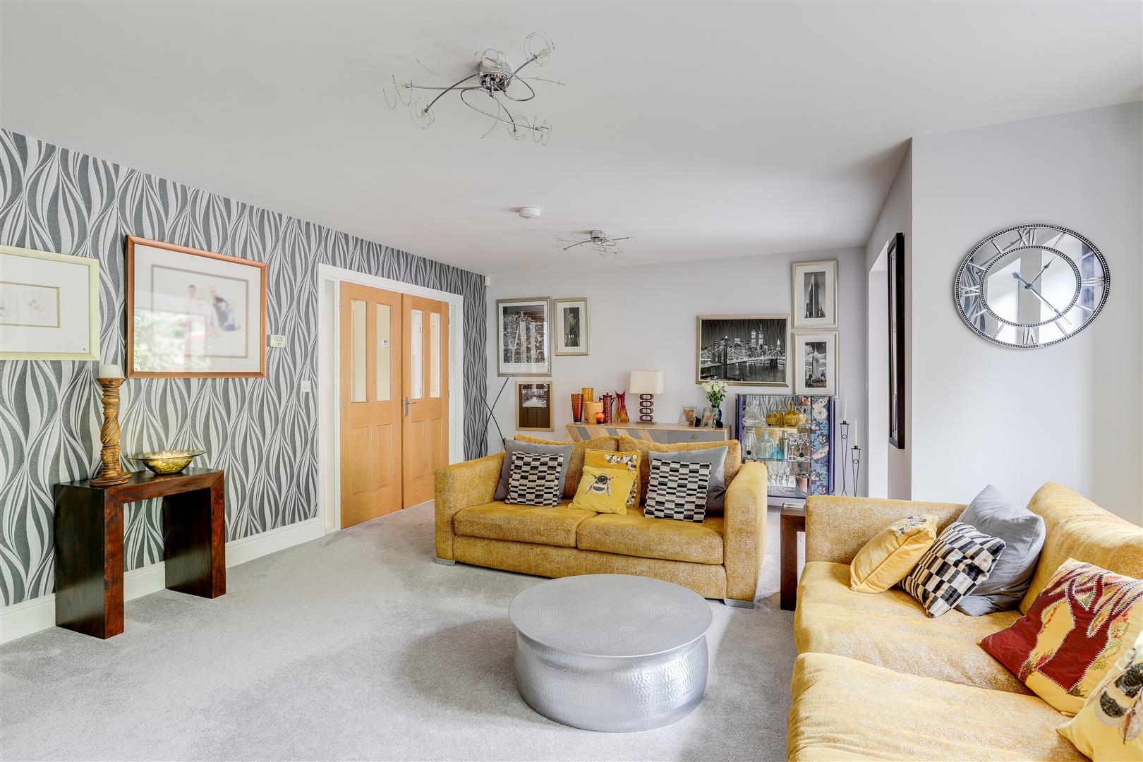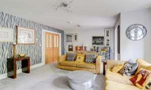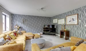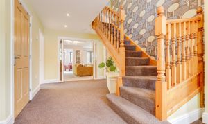 Dimensions: 5.30m x 4.00m (max) (17'4" x 13'1" (max)). The entrance hall features carpeted flooring with underfloor heating, an in-built cupboard, recessed spotlights, two UPVC double-glazed windows on the front elevation, and a UPVC door providing access to the accommodation.