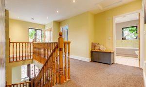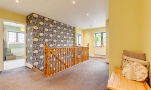 Dimensions: 5.64m x 4.11m (max) (18'6" x 13'5" (max)). The landing features carpeted flooring, a radiator, access to the partially boarded loft with lighting, and provides access to the first-floor accommodation.