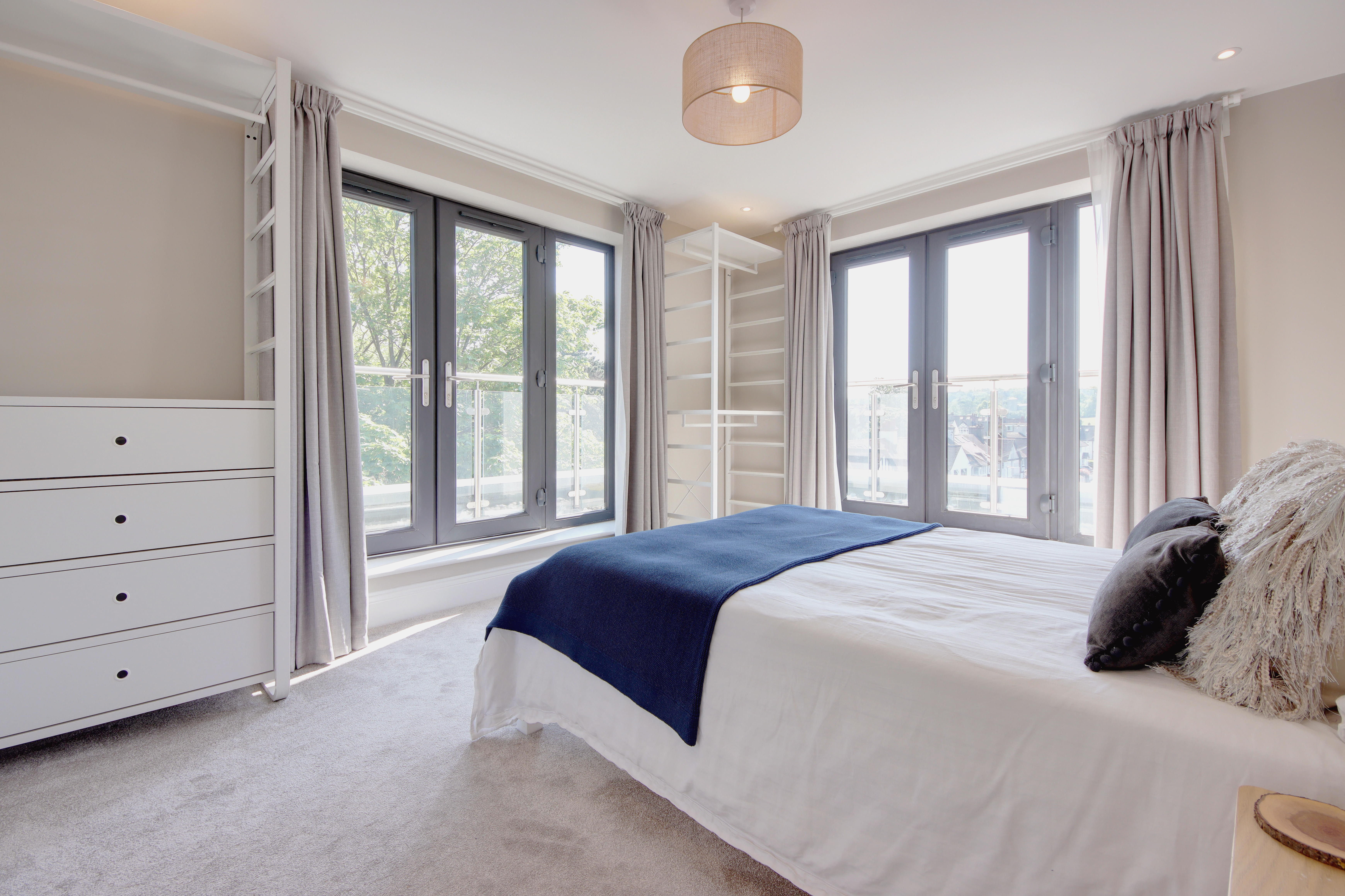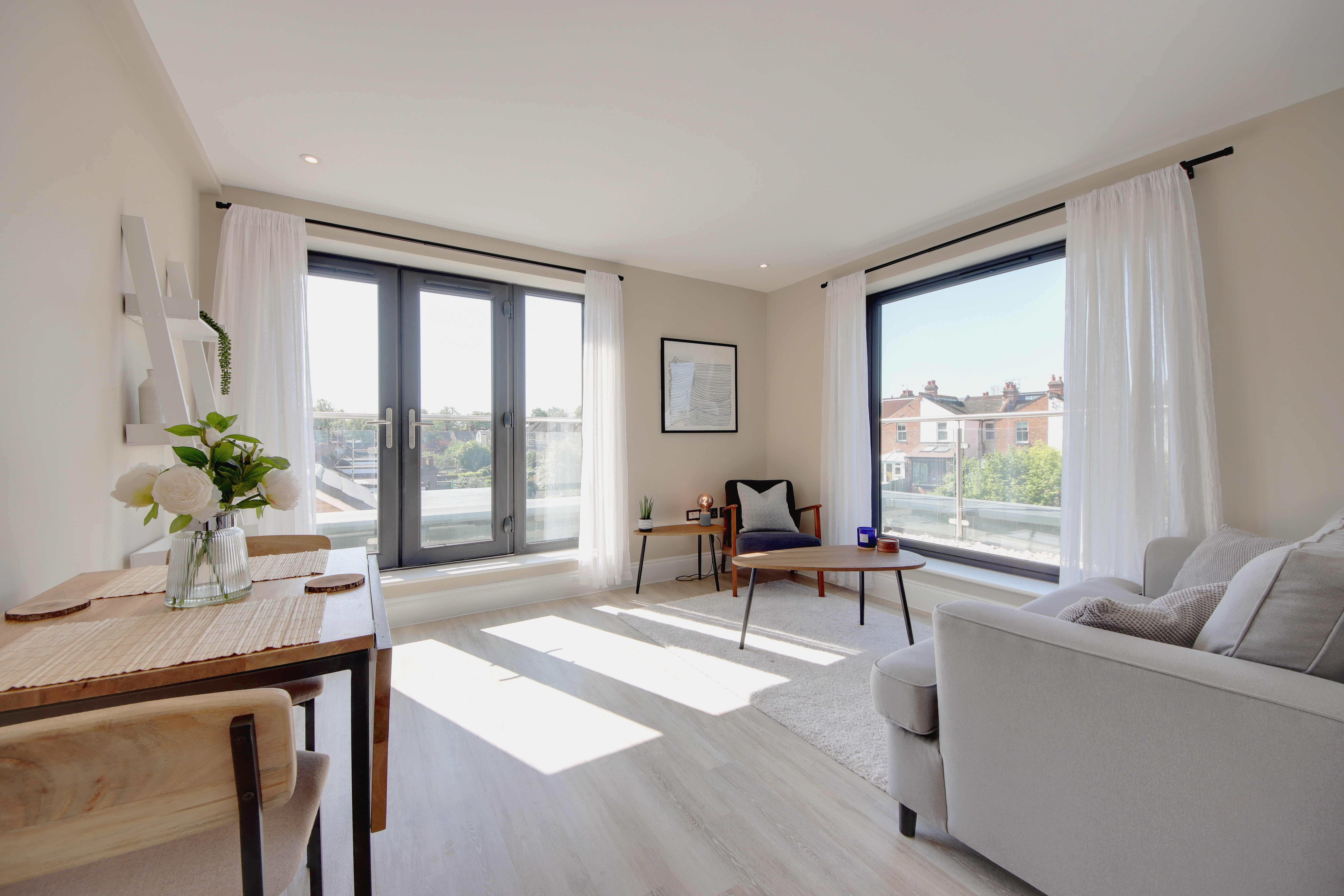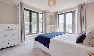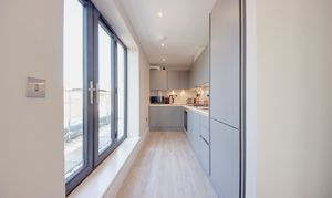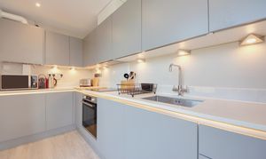 Accessed via the communal stairwell, a generous entrance hall sets the tone, offering a calm and considered arrival with access to all principal rooms. The open-plan living, dining and kitchen space is particularly well balanced, designed for both everyday living and entertaining. Anthracite-framed French doors open directly onto the balcony, extending the living space outwards and enhancing the connection to the views beyond. The kitchen is finished with clean-lined quartz worktops and integrated appliances, including an induction hob, with ample storage arranged both above and below. A full-height cabinet neatly houses the fridge-freezer, maintaining a streamlined aesthetic. The principal bedroom is notably spacious at over 13 feet, with ample room for freestanding storage. Dual-aspect French doors once again open onto the balcony, allowing light to pour in and offering a peaceful outlook. The bathroom is finished in crisp, full-height tiling, creating a refined and contemporary feel.