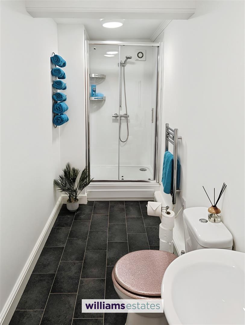 Dimensions: 3.7 x 1.3 (12'1" x 4'3"). Hand wash basin with taps over, lighting, low flush W.C, shower enclosure with power shower, extractor fan and wall mounted radiator.