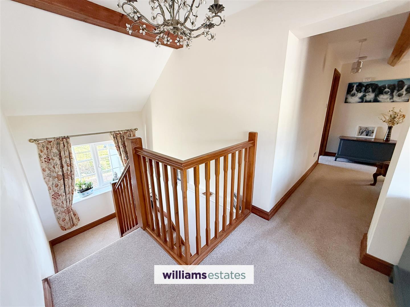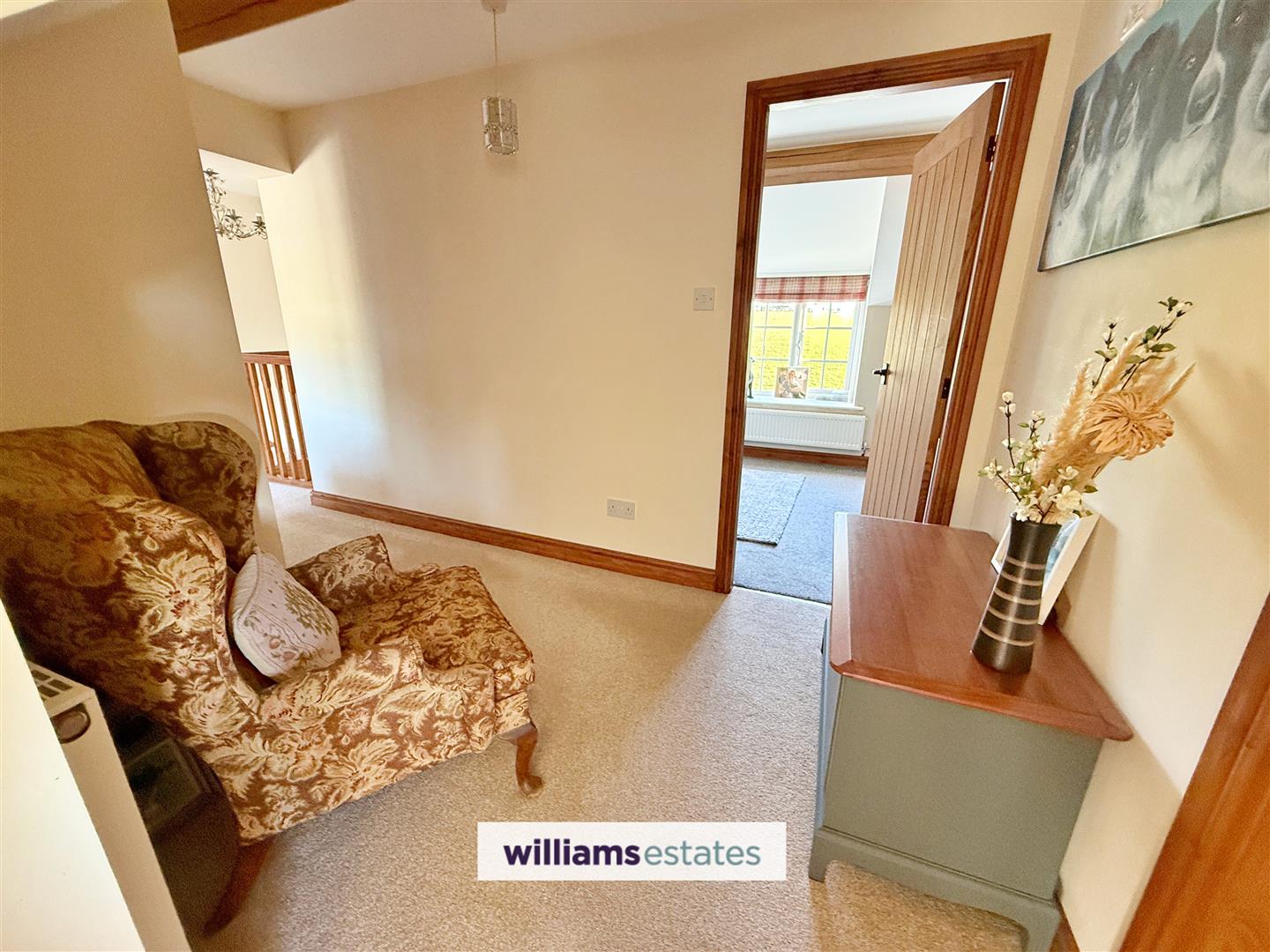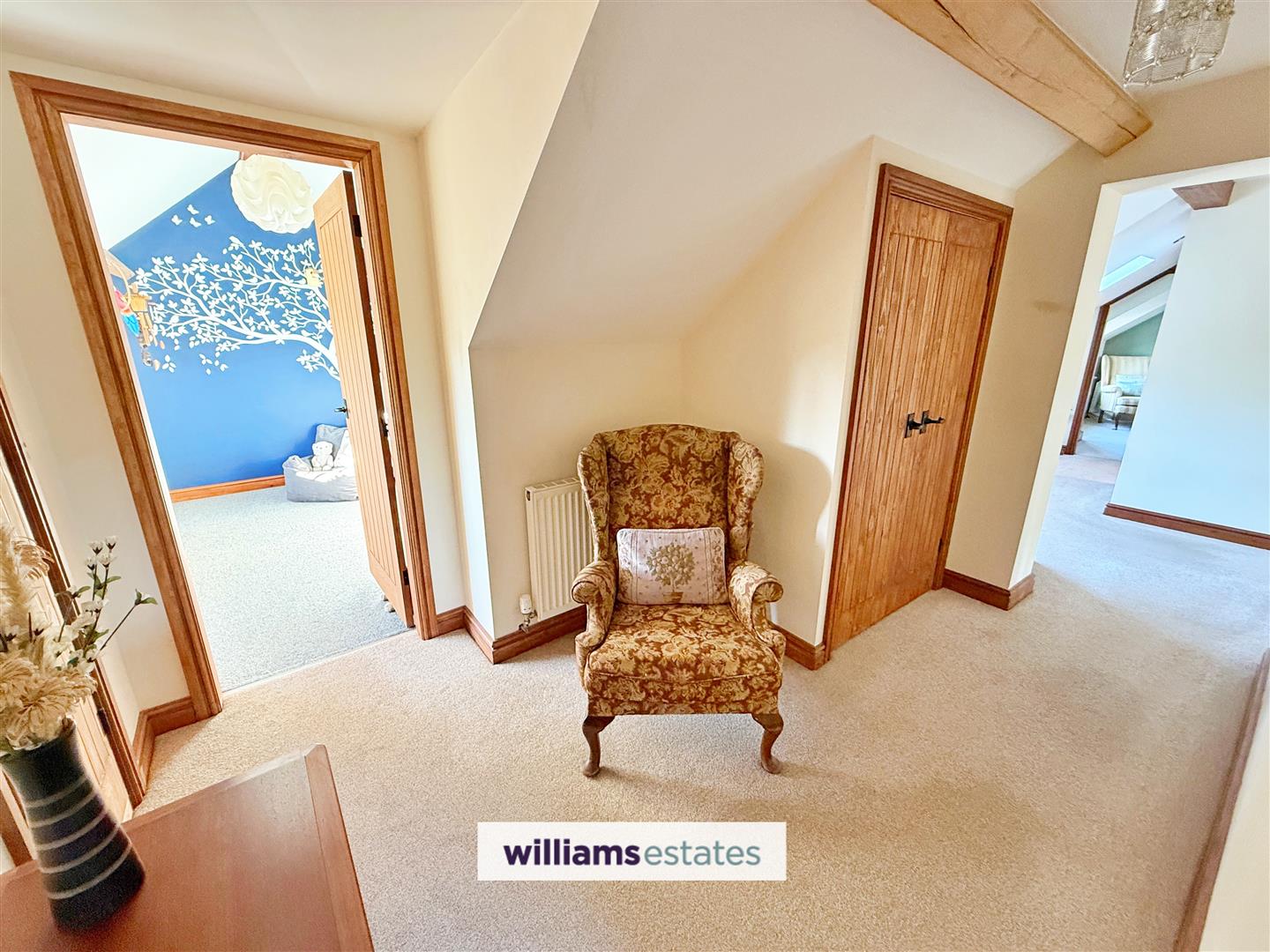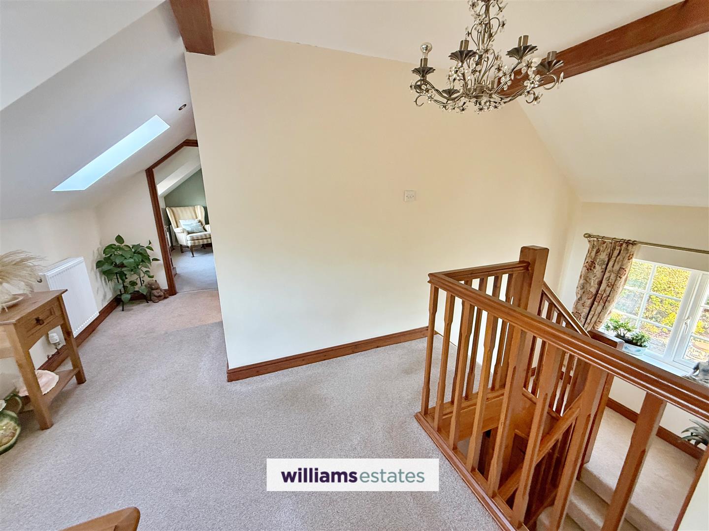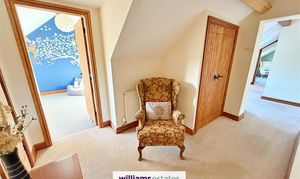 A fabulous size landing with uPVC windows to the front with stunning views, double radiator, power points, airing cupboard, Velux roof window and additional storage cupboard.