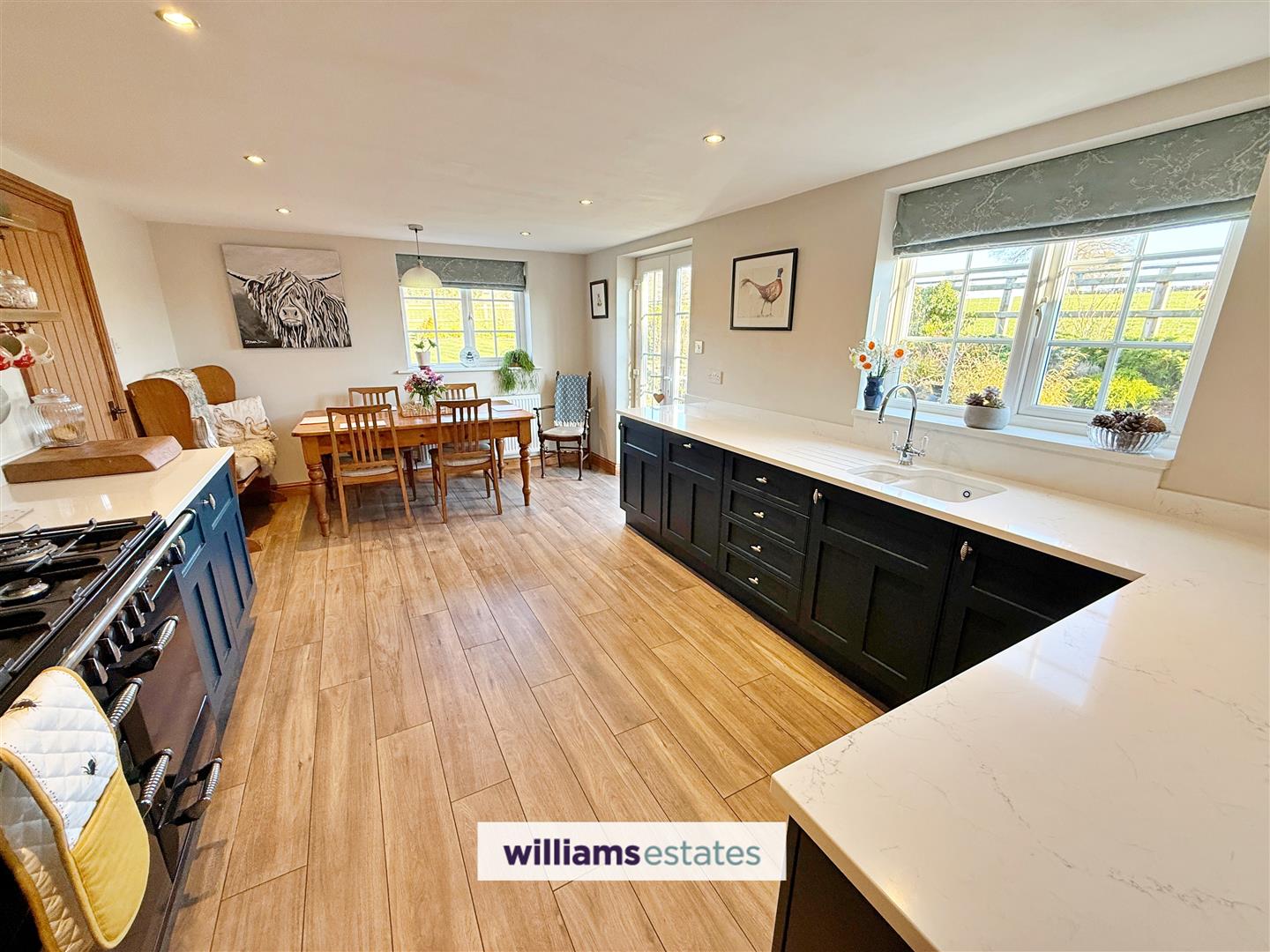 Dimensions: 5.4 x 3.42 (17'8" x 11'2"). Offering a range of modern drawer, base units & shelving with Quartz work surfaces over, bowl and half drainer inset sink with mixer tap, integrated appliances; Bosch dishwasher, & fridge. Dual fuel Rangemaster cooker with matching extractor hood above with attractive tiled splash back. Continued wood effect tiled flooring, double radiator, power points, double glazed double doors lead to the rear garden and further double glazed window looks onto the rear garden with views of the Clwydian Range.