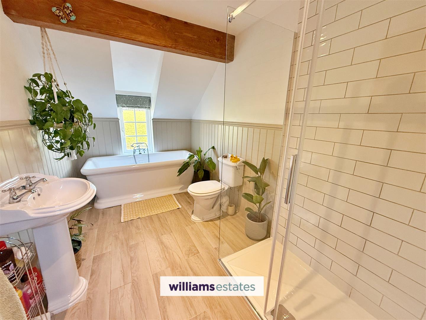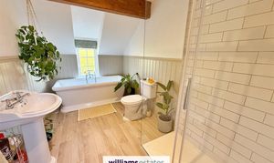 Dimensions: 3.53 x 2.0 (11'6" x 6'6"). A fabulous suite with low flush W.C, deep double ended bath with mixer taps and detachable shower head, pedestal wash basin, Triton electric shower with glass enclosure, timber effect tiled flooring, half level panelling, double radiator and uPVC double glazed window to the rear.