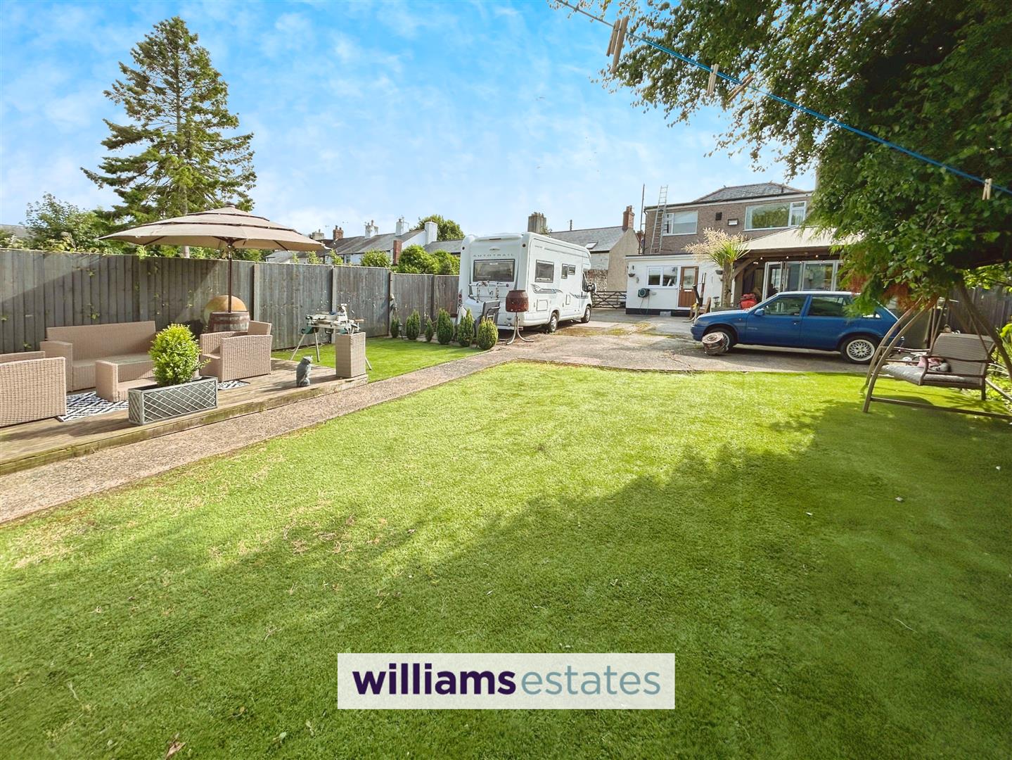 The property is approached by a wide driveway offering ample off street parking with the front garden offering a selection of mature shrubs and plants, Pathway leading to the alternative drive to the rear. From the driveway a large timber gate provide access to further off street parking and could accommodate a motorhome/caravan and business cars and vans if required. The rear garden is a hidden gem and offers a pergola and seating area off the day room, lawned garden, raised decked patio area and enjoys a private and sunny aspect.