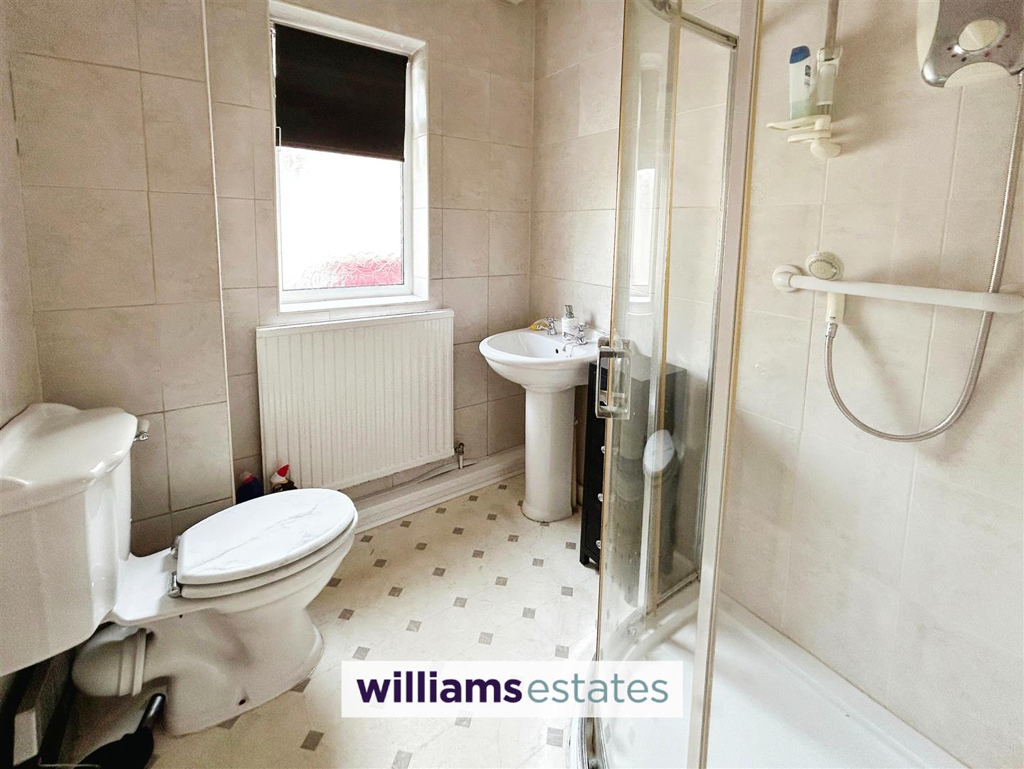 Dimensions: 1.91 x 1.96 (6'3" x 6'5"). Comprising of a corner shower cubicle with glazed screen, pedestal wash basin and WC, fully tiled walls, extractor fan, double glazed window and panelled radiator.