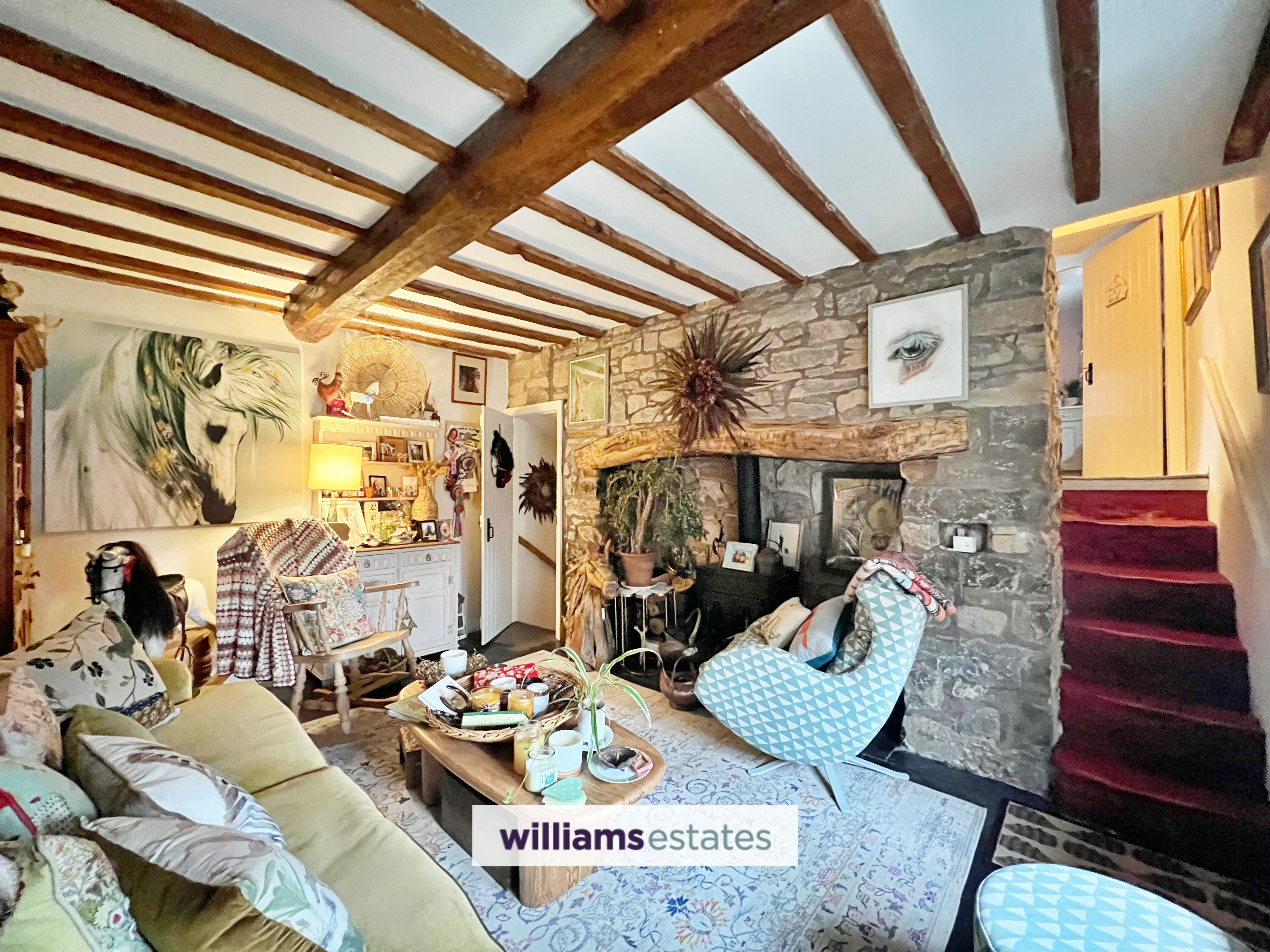 Stone steps guide you into the charming lounge, the heart of this home, featuring original slate flooring and a striking stone Inglenook fireplace with a multi-fuel burner. Exposed ceiling beams and built-in shelving add character, while a double-glazed window with a deep sill offers a pleasant view over the front of the property. From here, stone steps lead up to the third bedroom and bathroom, and a staircase ascends to the master bedroom and second bedroom.