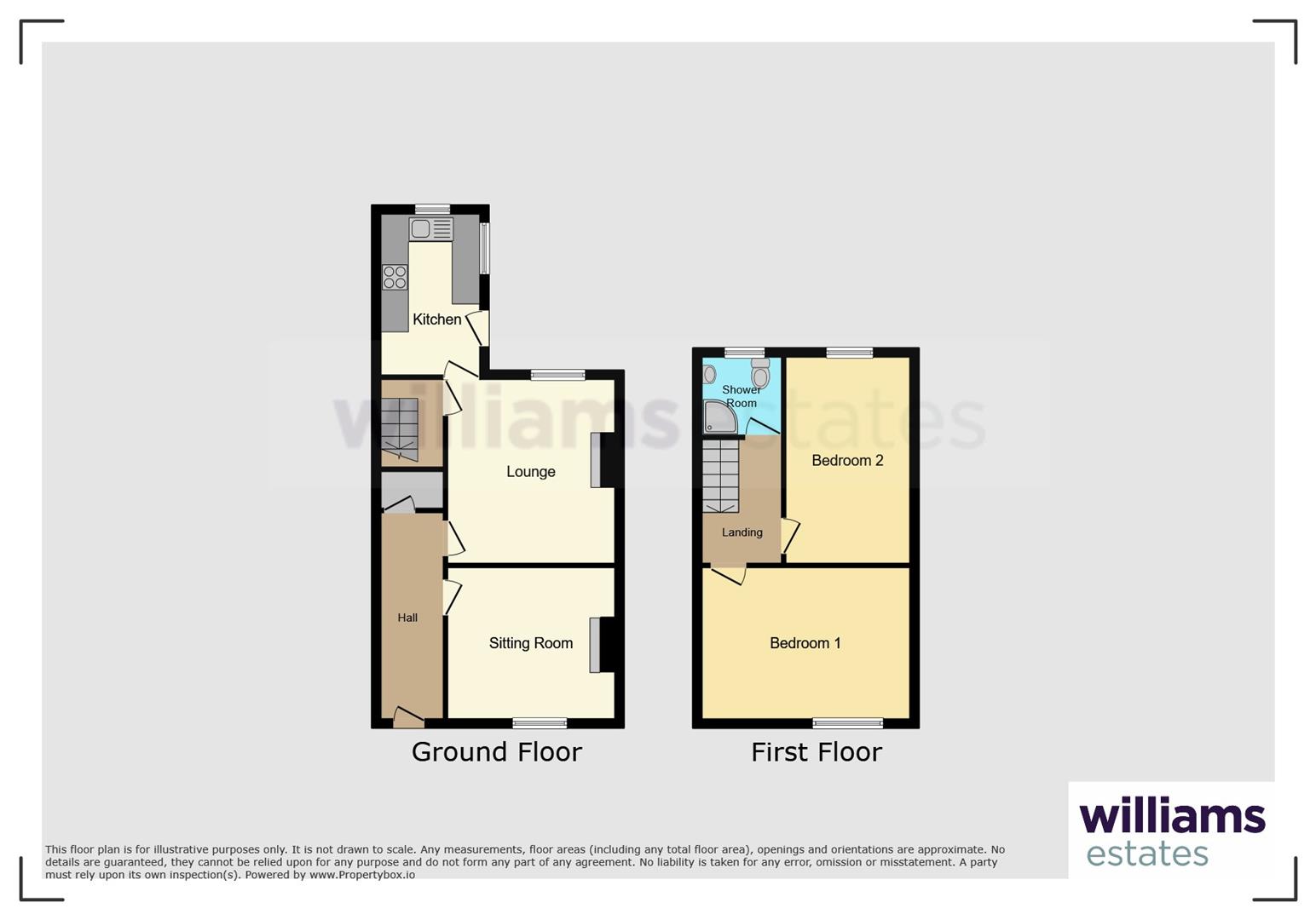 The accommodation comprises an inviting entrance hall, two well-proportioned reception rooms, and a modern kitchen. Upstairs, a light and airy landing leads to two generous bedrooms and a shower room.