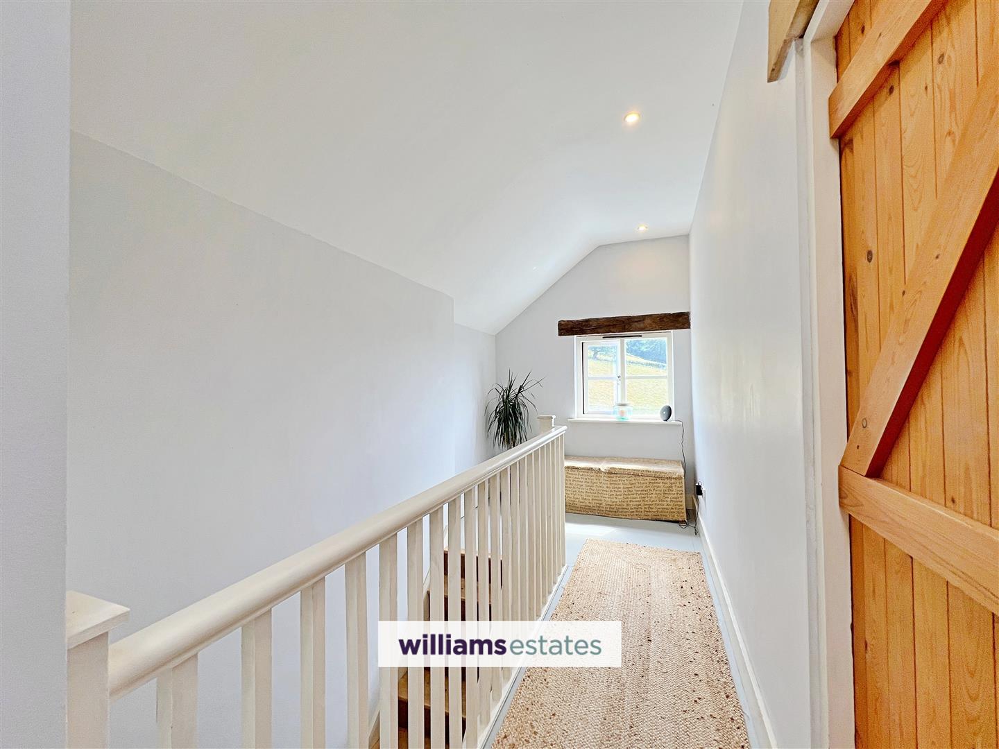 A bright and airy landing, featuring a glazed window to the rear elevation with views over the property’s fields and of the Clwydian Range. Roof windows flood the space with natural light, complemented by recessed spotlights and built-in storage cupboards. Two single radiators complete the landing, which provides access to all first-floor rooms.