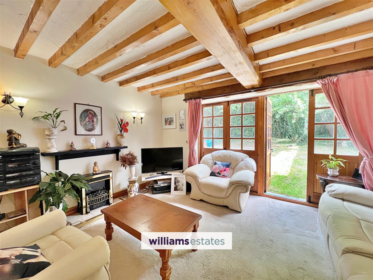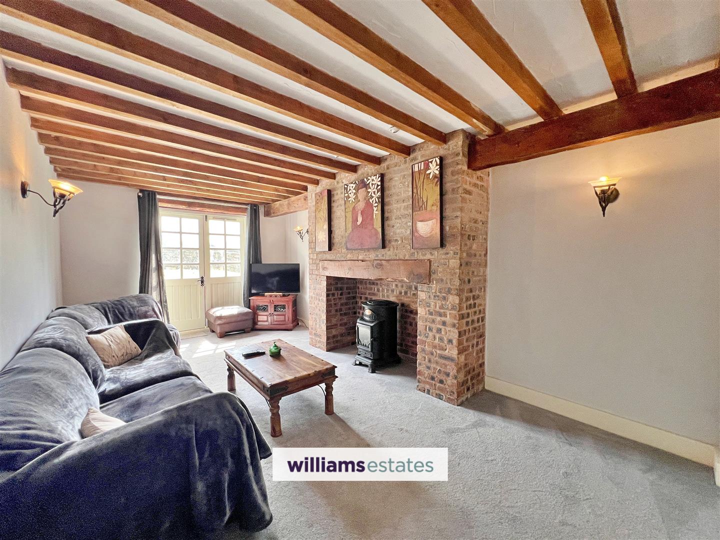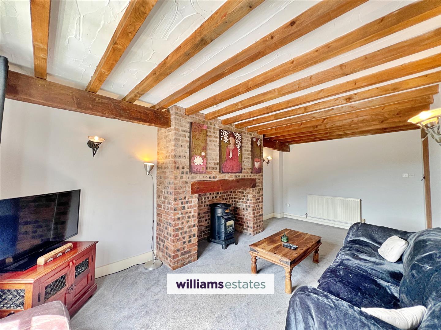 Dimensions: 5.94m x 3.23m (19'6" x 10'7"). A spacious and inviting lounge showcasing a feature brick-built fireplace with inset burner, creating a warm focal point to the room. The charm is further enhanced by a feature beamed ceiling and wall lighting, while modern comforts include a radiator and ample power points. Double doors to the rear.