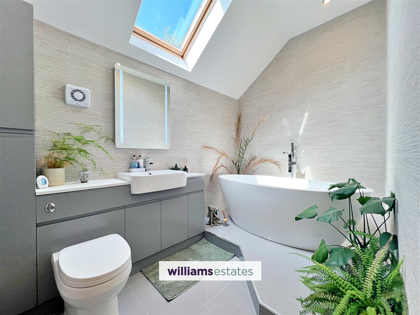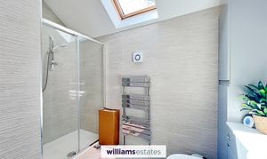 Dimensions: 2.11m x 1.57m (6'11" x 5'2"). Fully tiled from floor to ceiling, this contemporary bathroom features a glazed roof window that floods the space with natural light. It includes a corner walk-in shower enclosure, vanity wash basin, low-flush W.C., chrome heated towel rail, extractor fan, and recessed downlights for a sleek, modern finish.