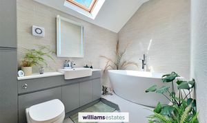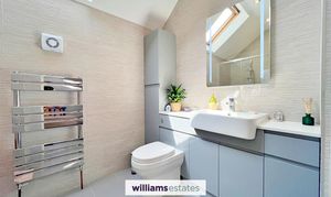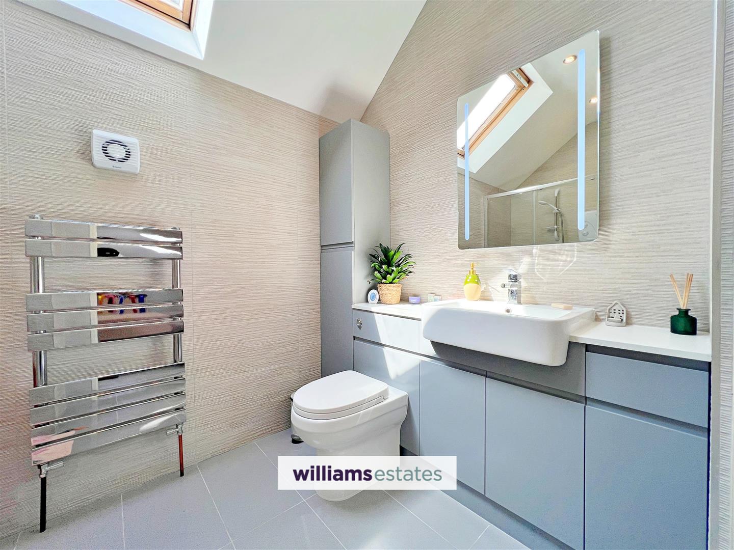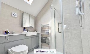 Dimensions: 3.10m x 1.75m (10'2" x 5'9"). In keeping with the style of the main and en-suite bathrooms, this contemporary space features a low-flush W.C., vanity wash basin, and a walk-in shower enclosure. Finished with two complementary tiles for the floor and walls, a chrome heated towel rail, and a glazed roof window.