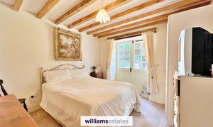 Dimensions: 3.30m x 3.18m (10'10" x 10'5"). A spacious downstairs bedroom, featuring a charming beamed ceiling, radiator, and convenient power points. Double doors to the front of the property provide both natural light and direct access to the outside.