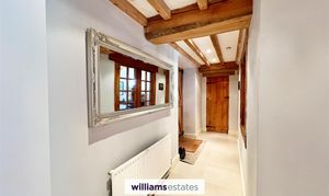 A welcoming hallway featuring a radiator, power points and a useful storage cupboard housing the central heating system. A door provides access to the side patio area, while the feature beamed ceiling adds character. Stairs rise to the first floor, with further accommodation leading off.