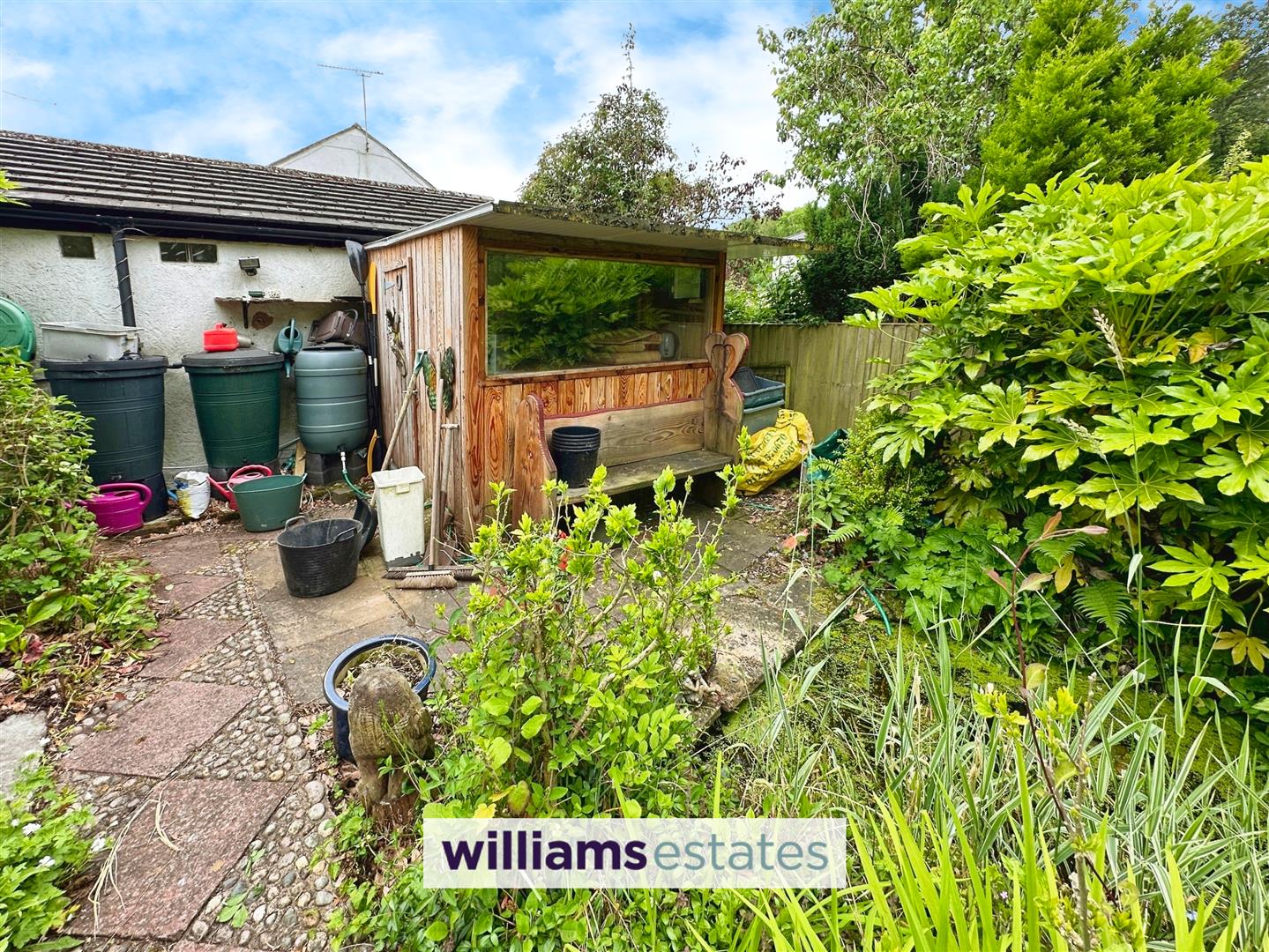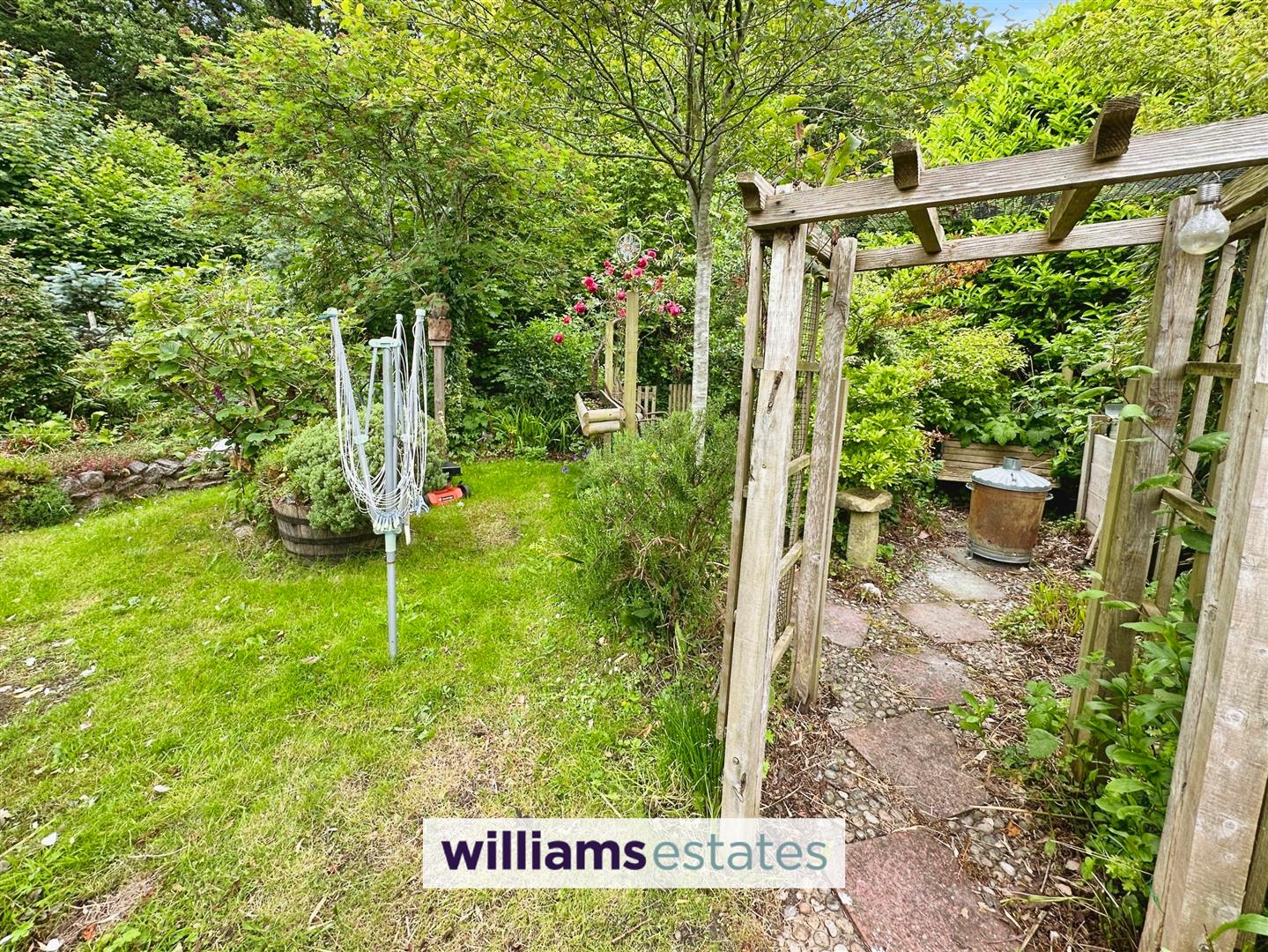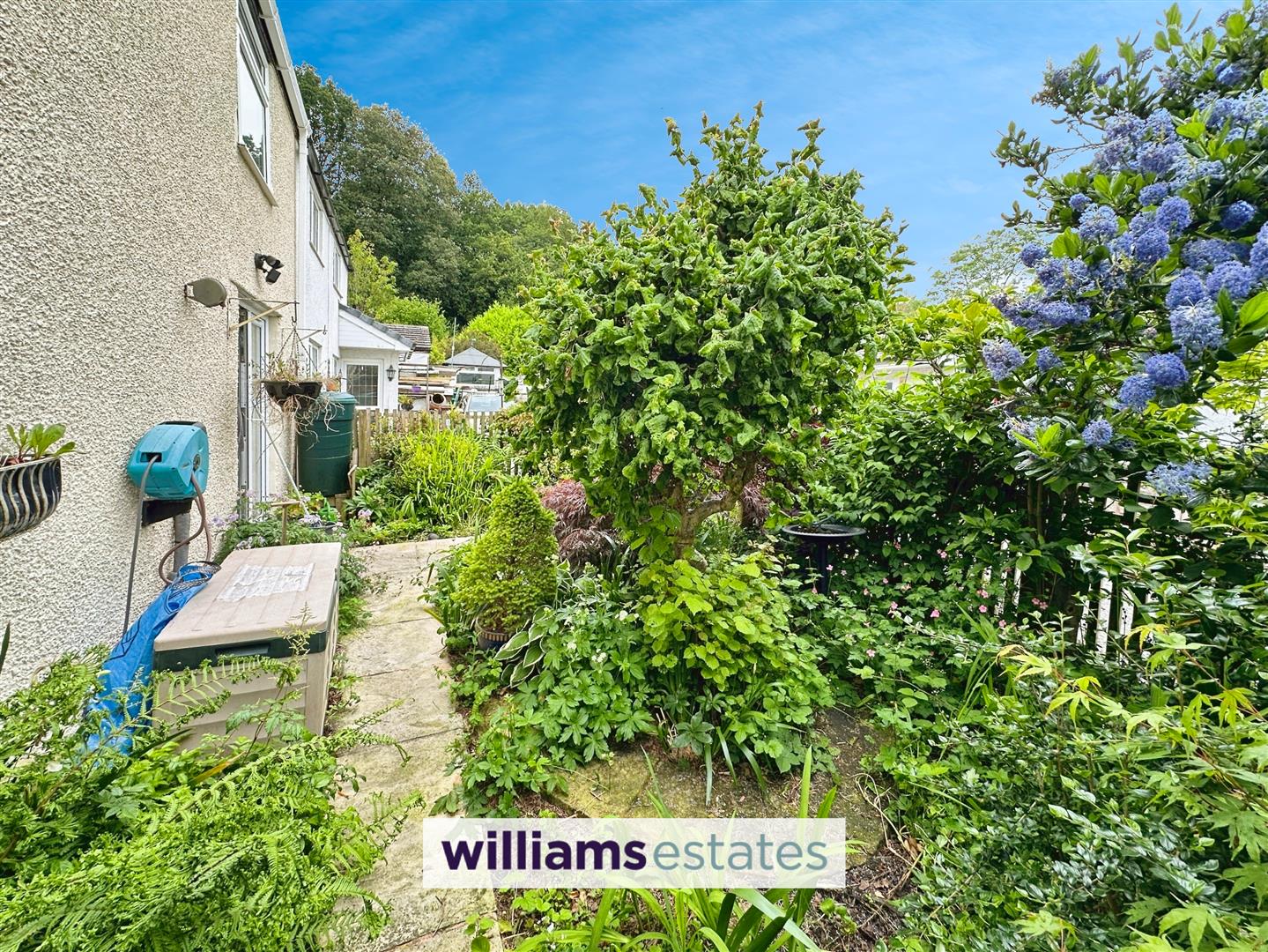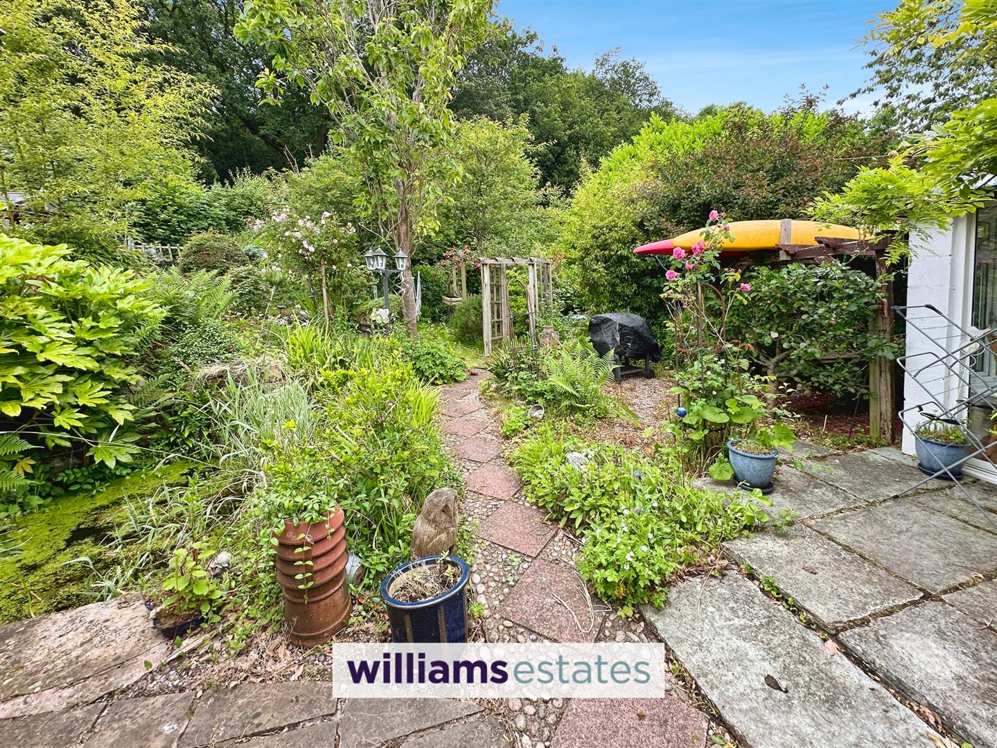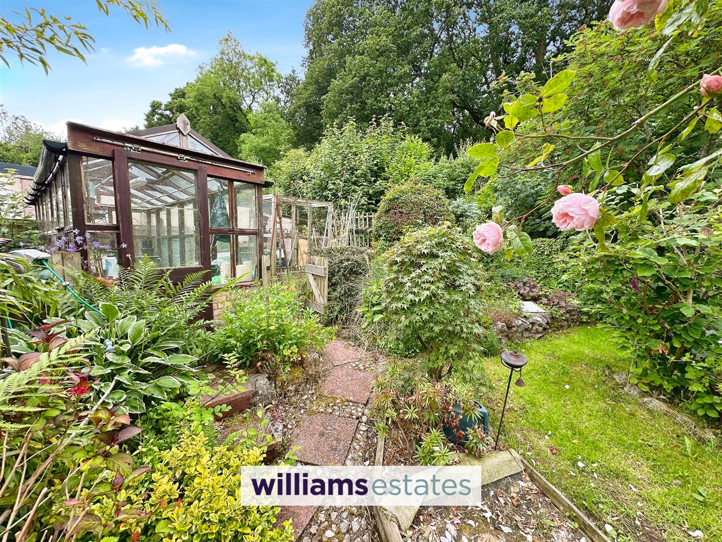 The front of the property includes a stone chipped area with off-road parking for two vehicles. To the side is a well presented garden with varieties of plants and greenery, with a stone paved pathway. The driveway leads past the neighbouring property to the rear garden area with a spacious garage, an outside gardening room and timber storage shed. This area has an ornamental pond with surrounding plants and shrubs, including a further garden past the neighbouring property, with vegetable beds and a step down to a water stream that continues along the rear property boundary.