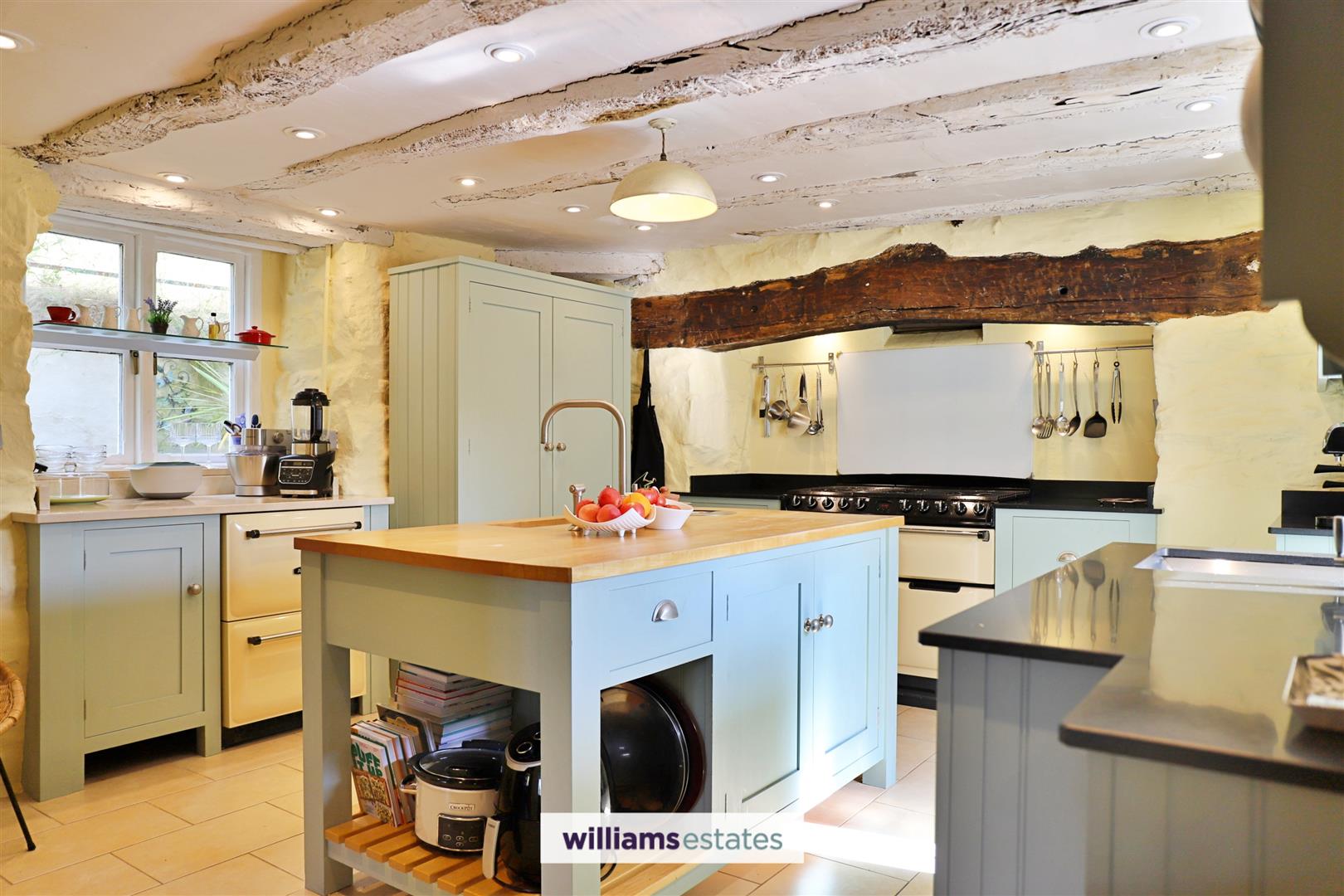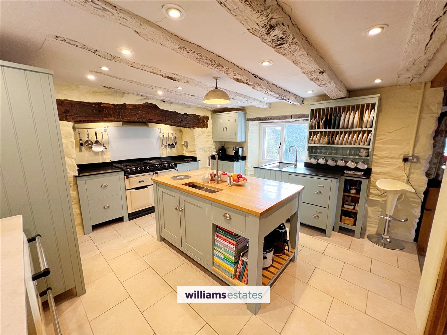 Behind its historic exterior, Ty Gwyn reveals a home thoughtfully designed for modern living. At its heart lies a bespoke kitchen with handcrafted hardwood cabinetry and sleek granite worktops, a true delight for any cook. The kitchen flows effortlessly into the generous dining area, where a log burner and traditional plank-and-muntin partition wall create a striking backdrop for gatherings with family and friends. For quieter moments, the sitting room offers a retreat brimming with charm – exposed beams, an inglenook fireplace with wood-burning stove, and far-reaching views across the Aled Valley combine to create an atmosphere of comfort and character. With the benefit of underfloor heating throughout and high-quality integrated appliances, this home blends period detail with contemporary convenience in perfect harmony.