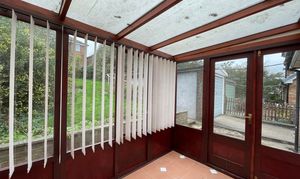 This is timber and single glazed with a timber and glazed door, tiled floor and enjoying a pleasant aspect over a westerly facing rear-garden.