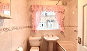 This is fitted with a frosted PVCU double glazed window, ceiling light point, floor to ceiling tiled walls, central heating radiator and fitted with a suite comprising panelled bath, pedestal wash space and low flush WC.