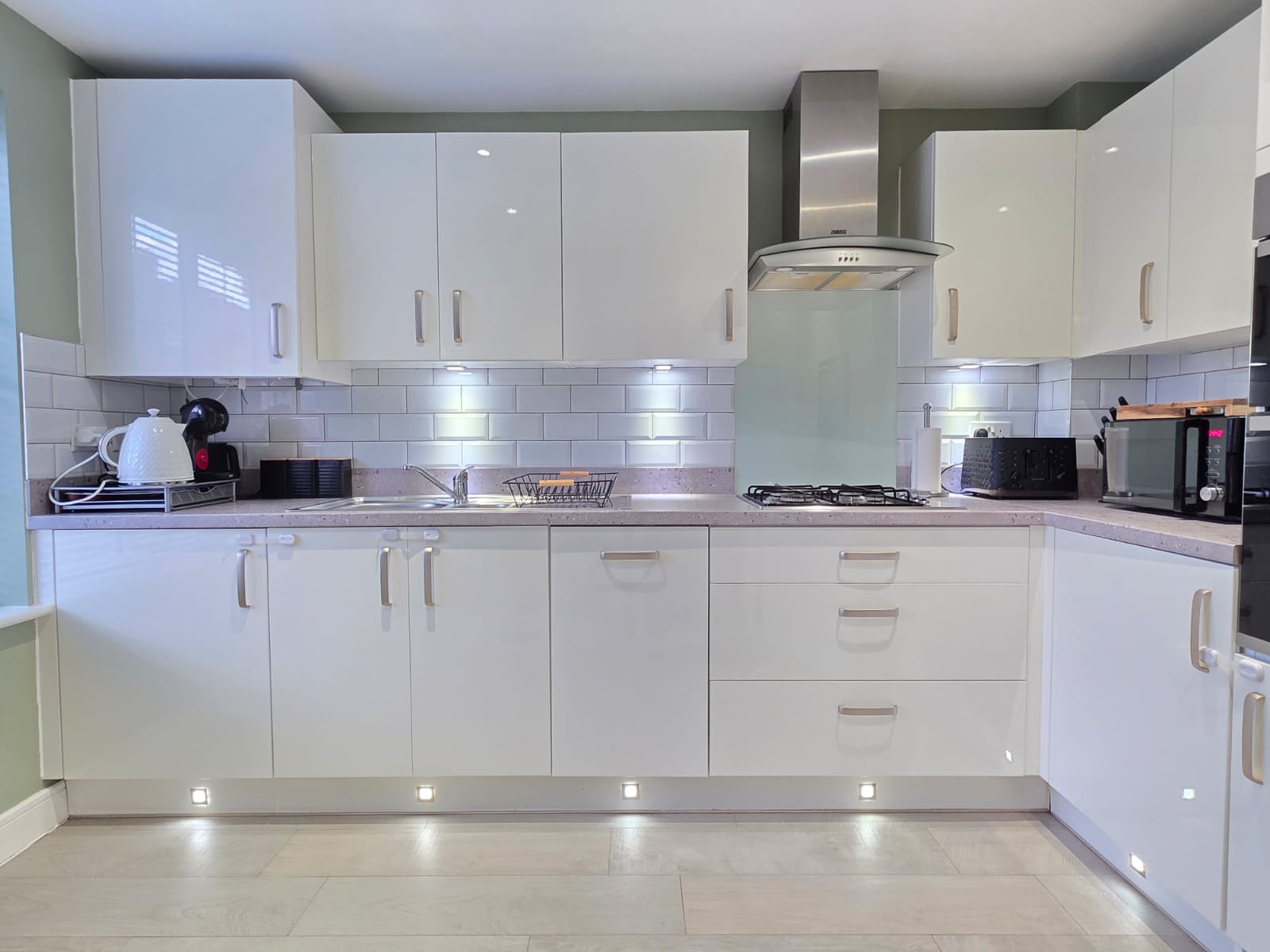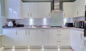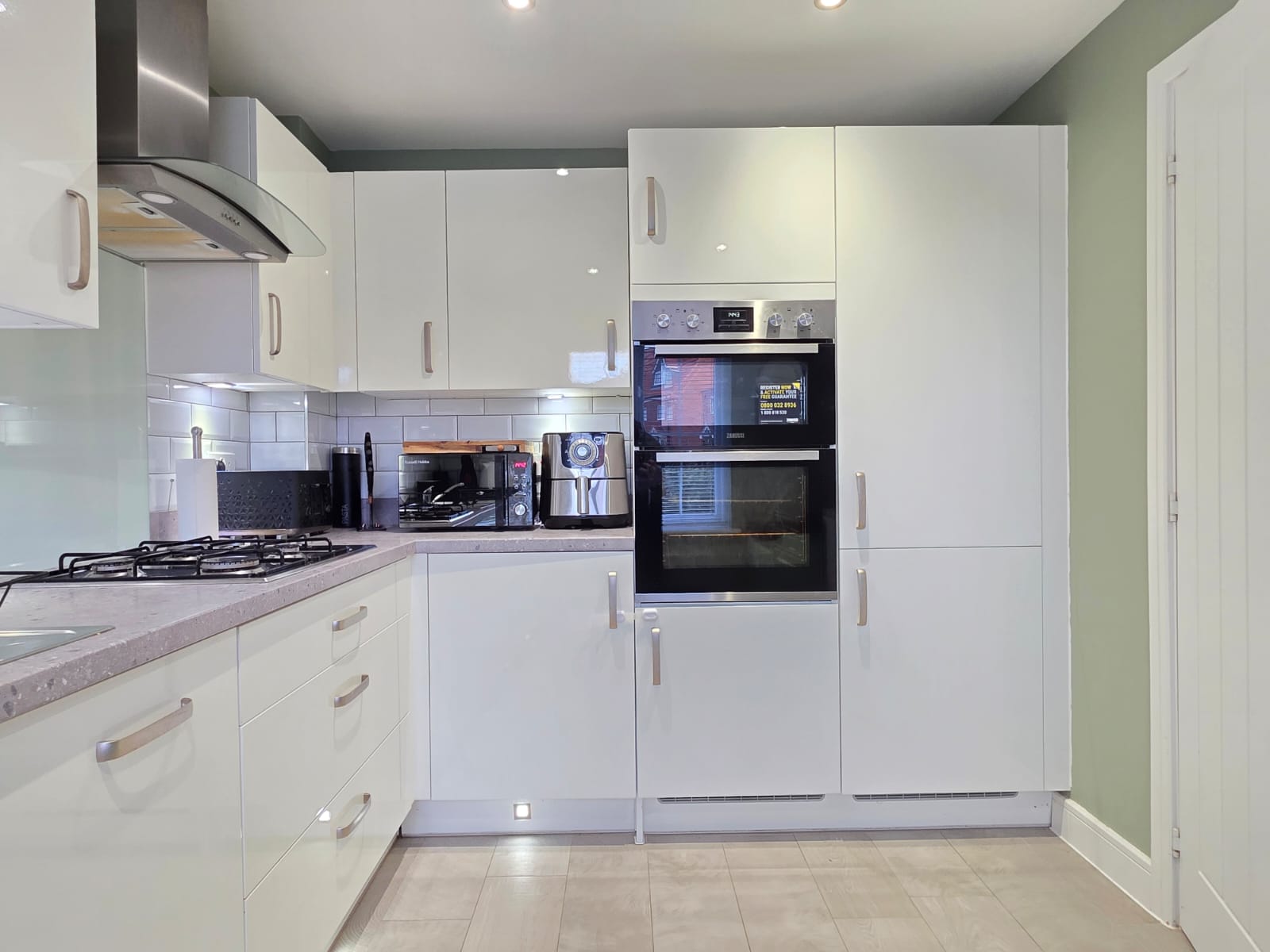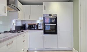 This offers a range of wall and base units with rollover worktop, stainless steel and drainer unit with mixer tap, gas hob, extractor hood, Zanussi double oven, integrated fridge/freezer, integrated dishwasher, integrated washer/dryer, under unit and kick-board lighting, spotlighting, tiled splashbacks, radiator, Moduleo flooring and UPVC double glazed window.