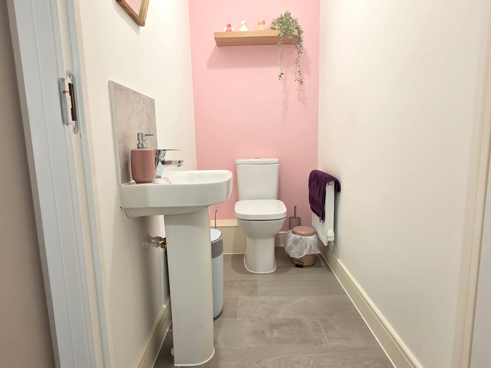 Includes from a low level WC, wash hand basin with mixer tap and tiled splashback, Moduleo flooring and radiator.