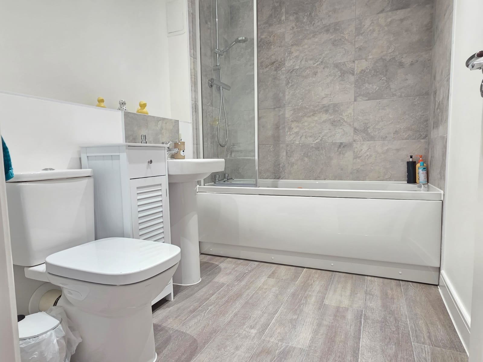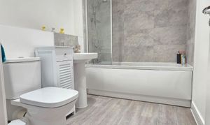 The family bathroom comprises of a panel bath with shower over, low level flush WC, wash hand basin with mixer tap, part tiled walls, extractor, radiator and Moduleo flooring.