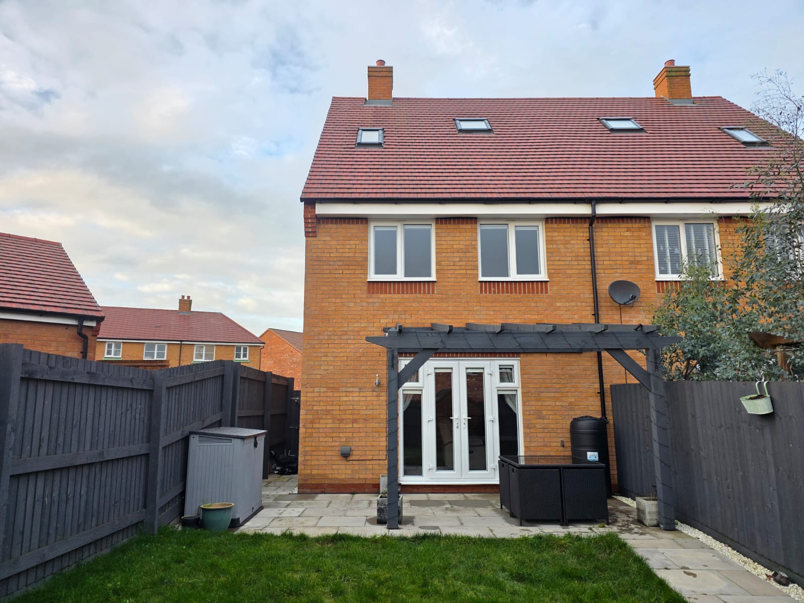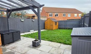 The rear garden offers a generous patio with pagoda, pathway leading to the shed, lawn area, fenced boundaries, electric point and cold water tap.