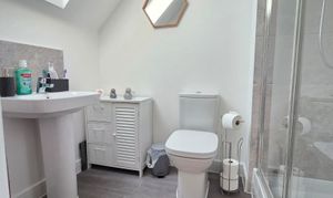 This includes a walk-in shower cubicle, low level flush WC, wash hand basin with mixer tap and tiled splashback, vulex roof window, radiator and Moduleo flooring.