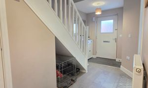 This lovely open hallway offers radiator, under-stair storage, carpeted stair-case, Moduleo flooring, leading to first floor plus access into the kitchen/diner, ground floor WC and lounge.