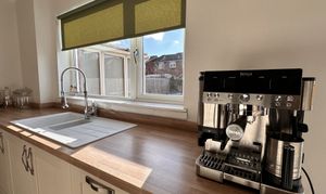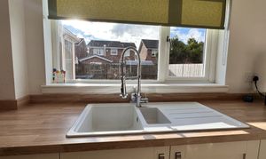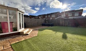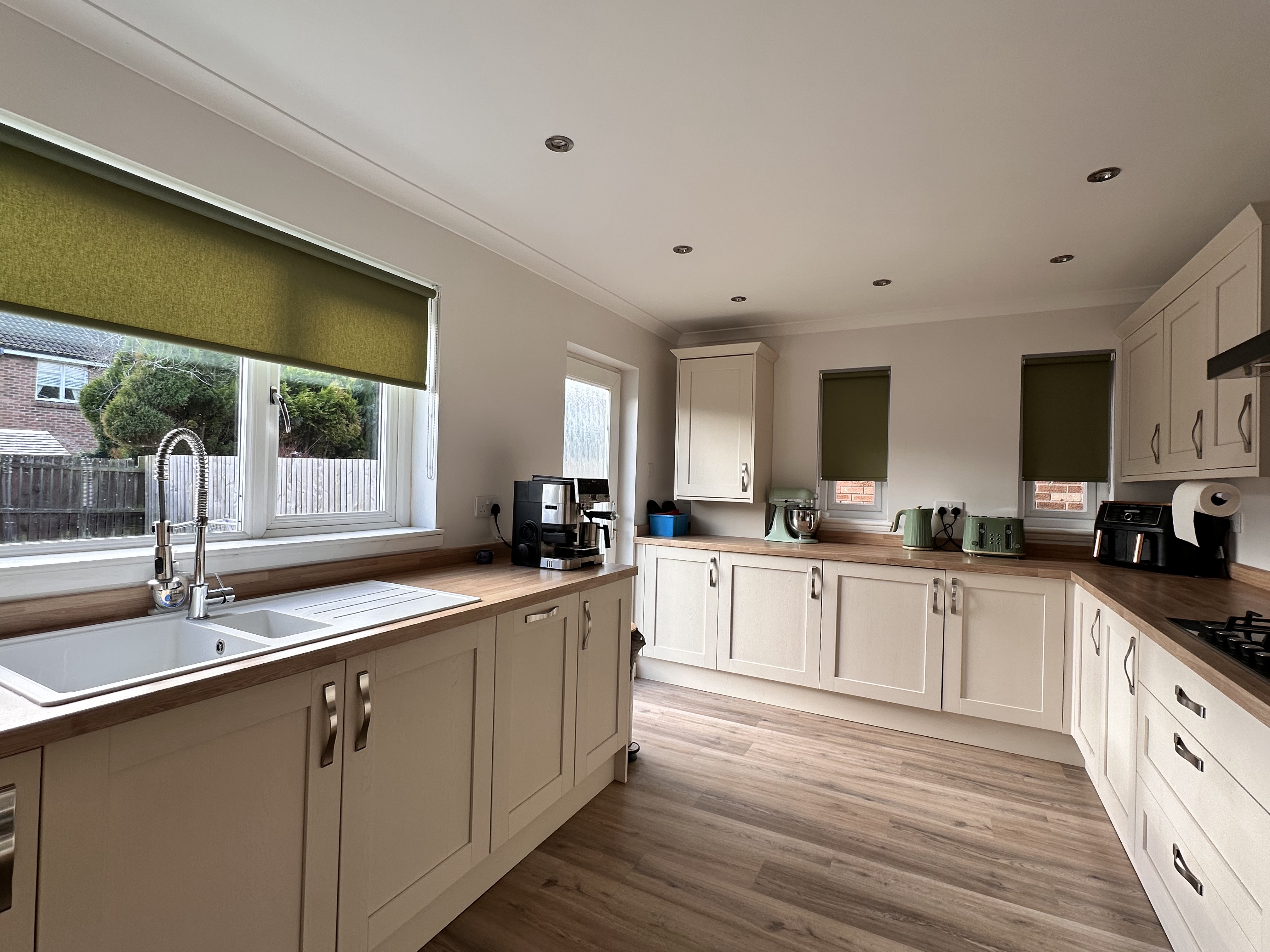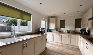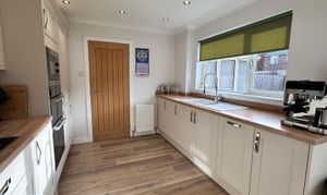 - Modern fitted kitchen with an array of wall and floor mounted units and matching wipe clean surface, double glazed window formation to the side and rear.