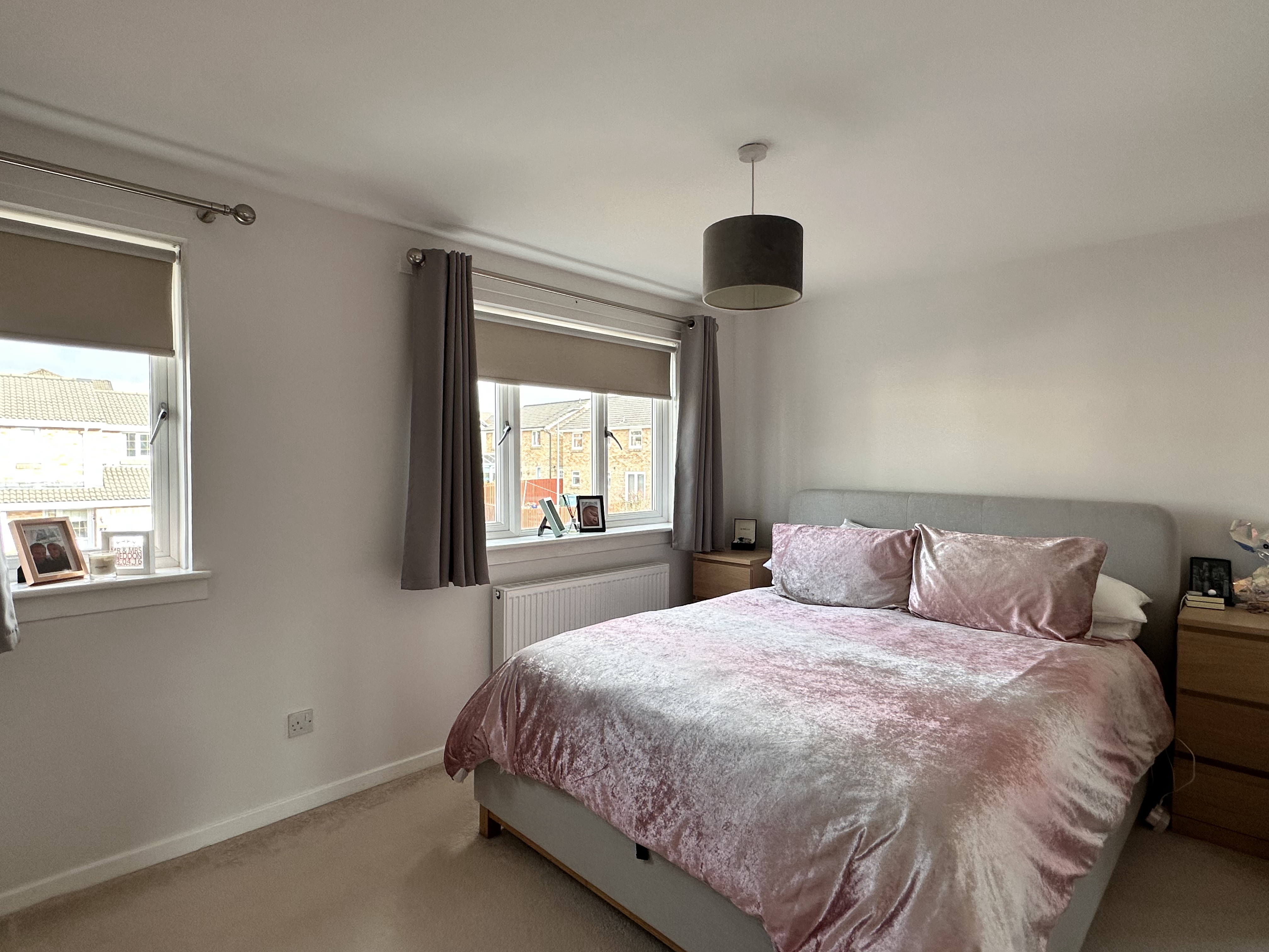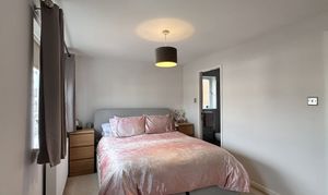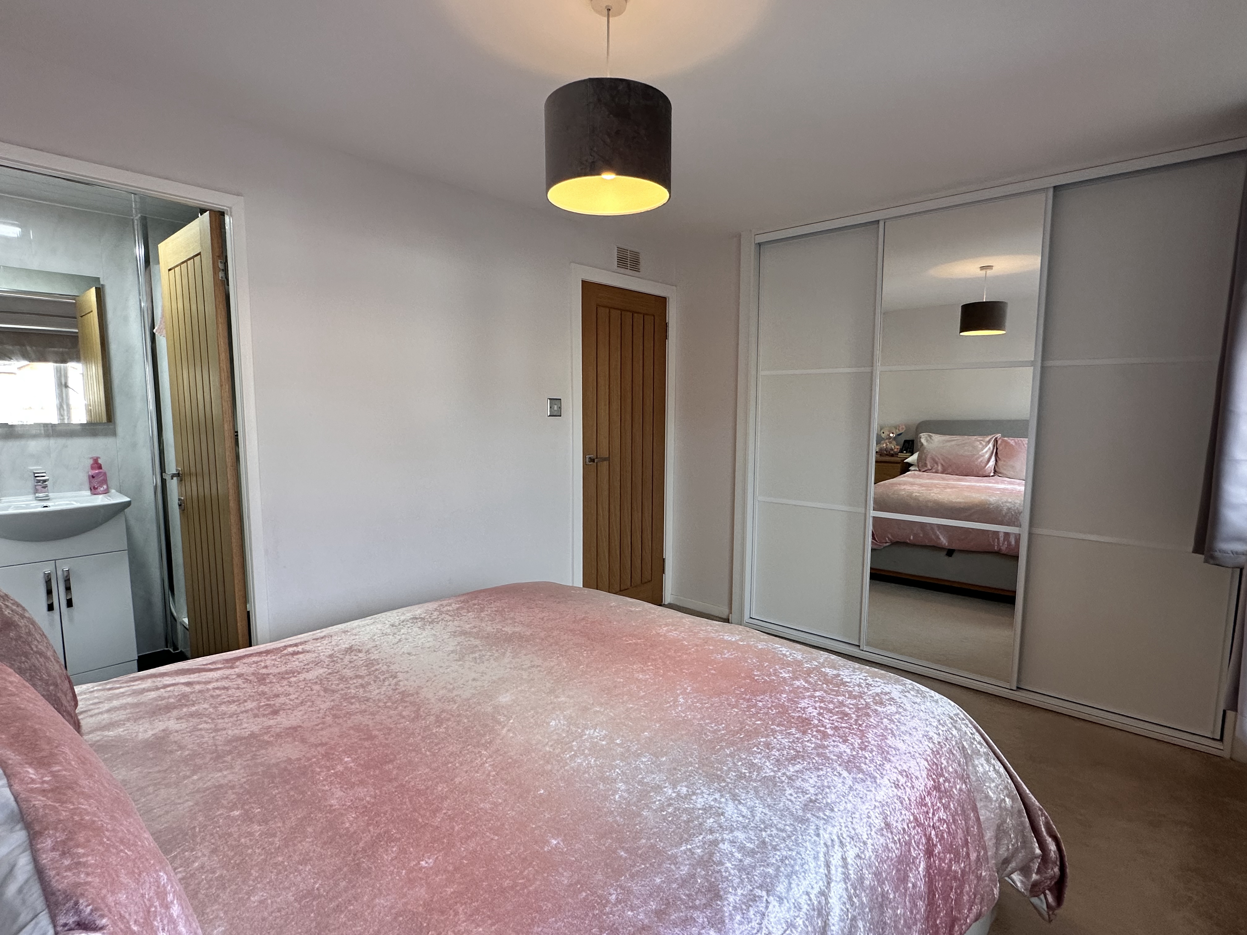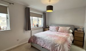 Upstairs, the master bedroom provides a relaxing retreat, complete with fitted wardrobes offering a range of shelving and hanging facilities, plush carpeting, neutral tones throughout, and two double glazed windows to the front.