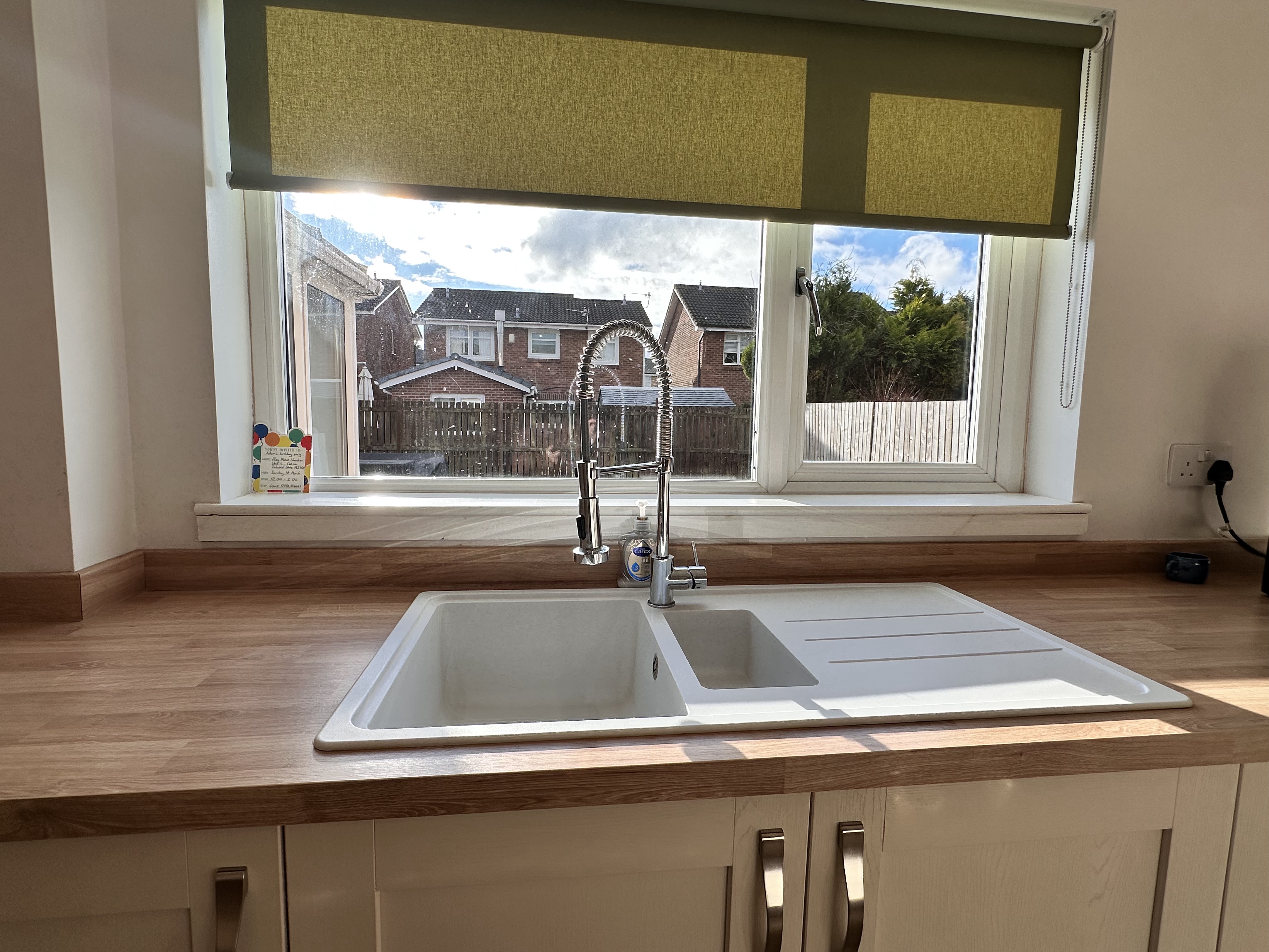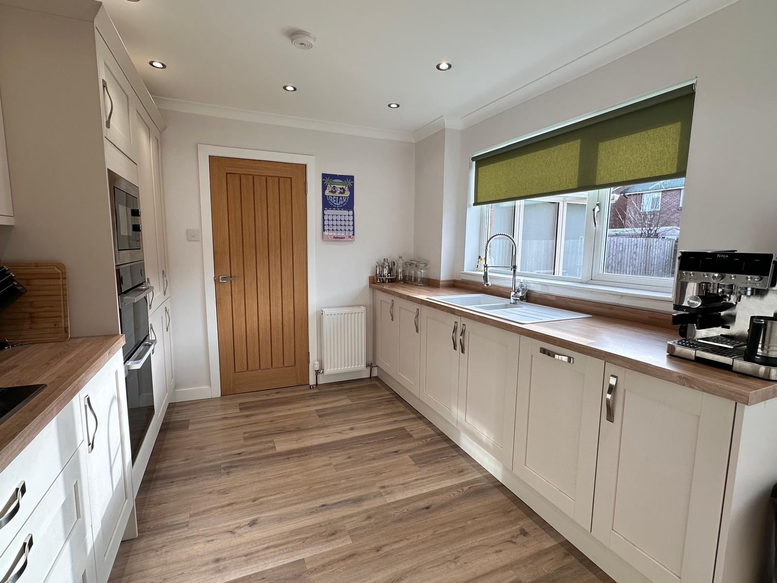 The modern fitted kitchen is equipped with an array of wall and floor mounted units and matching wipe-clean surfaces, while double glazed windows to the side and rear ensure a light and inviting atmosphere.