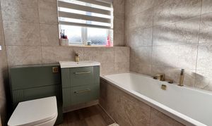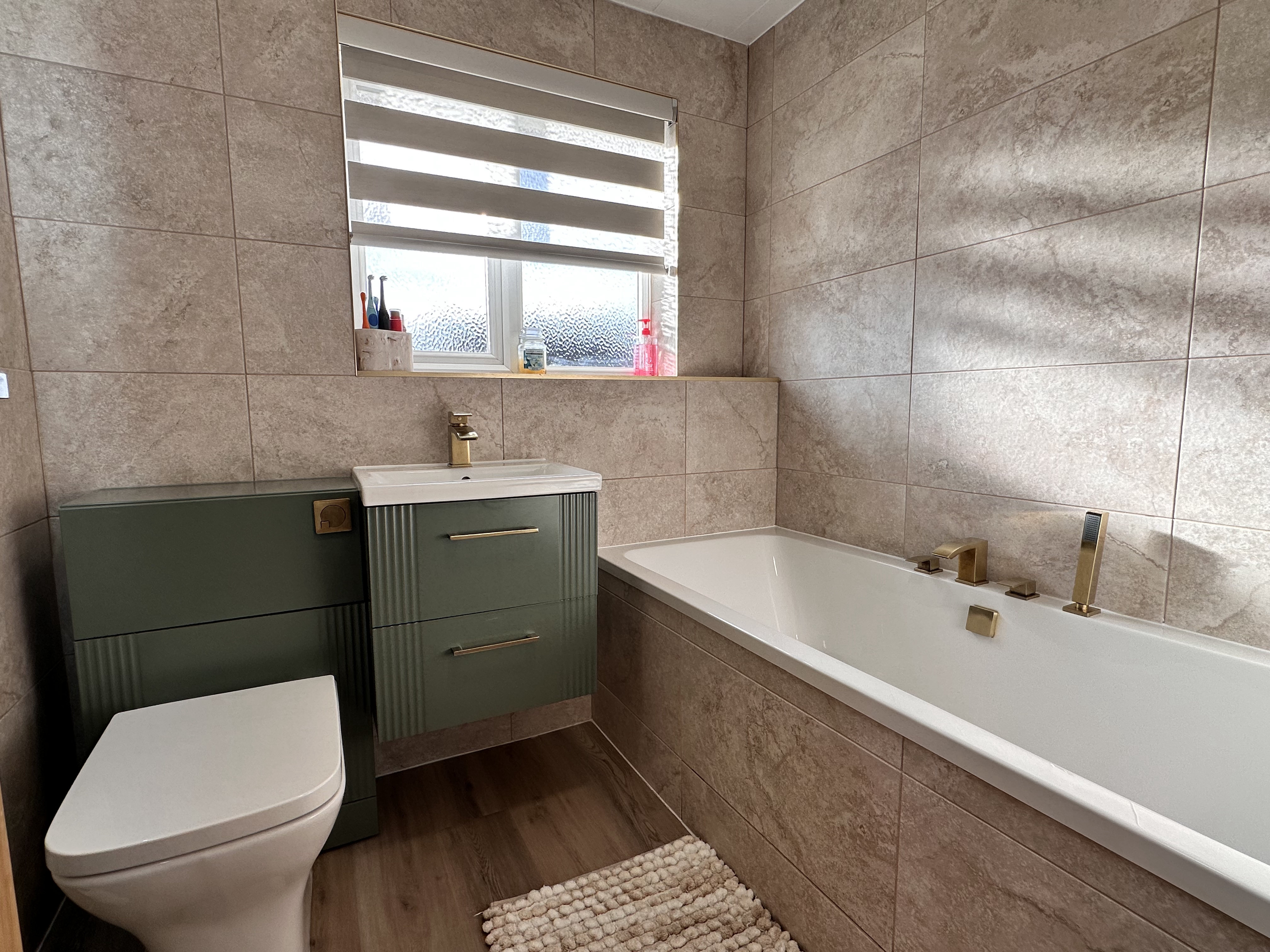 The family bathroom comprises a low level WC, wash hand basin, and bath with shower attachment, with tiling to full height for a modern finish.