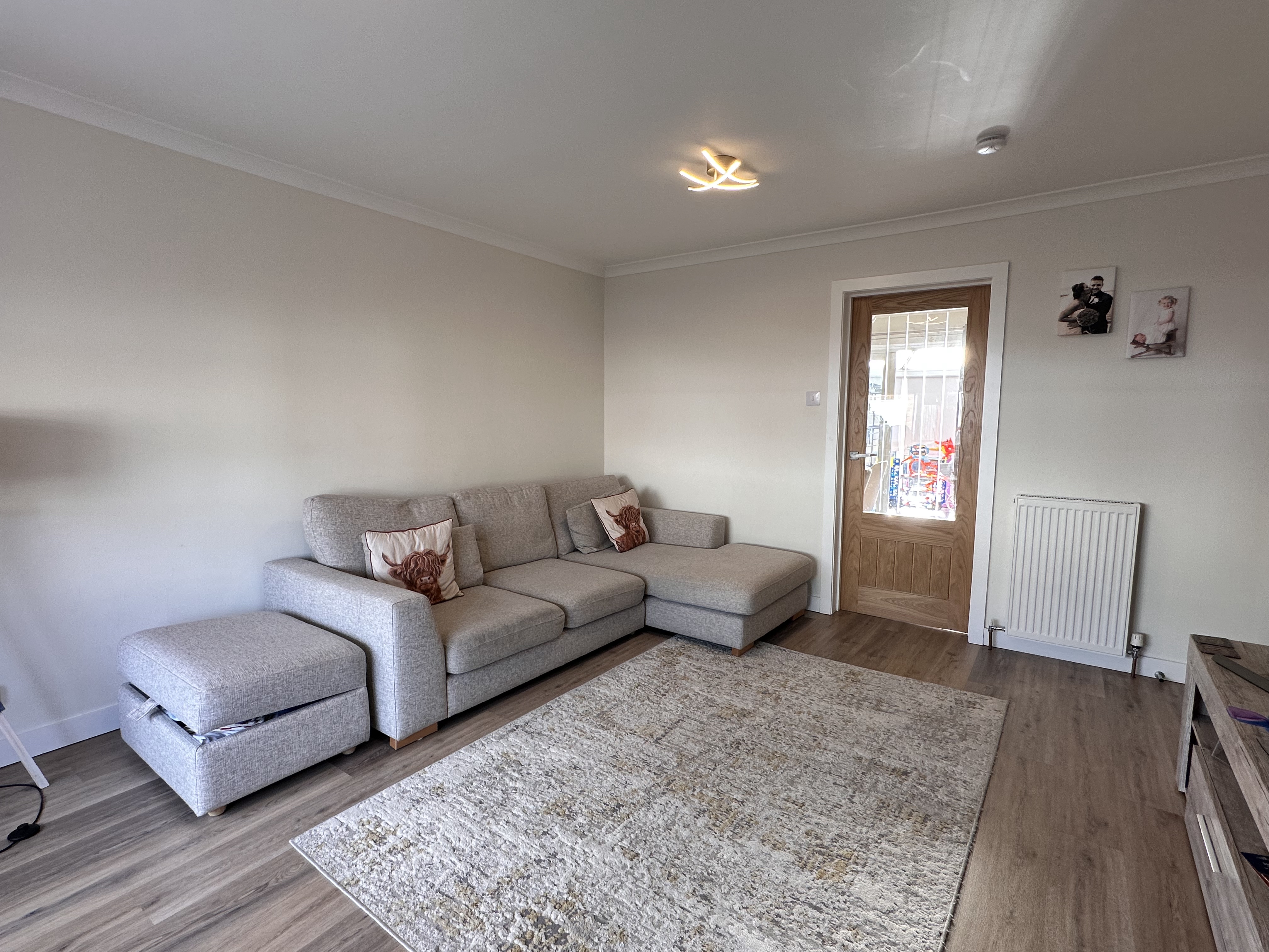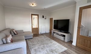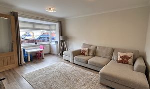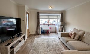 - Bright and airy lounge with bay window formation to the front allowing natural sunlight, neutral decor, laminate flooring.
