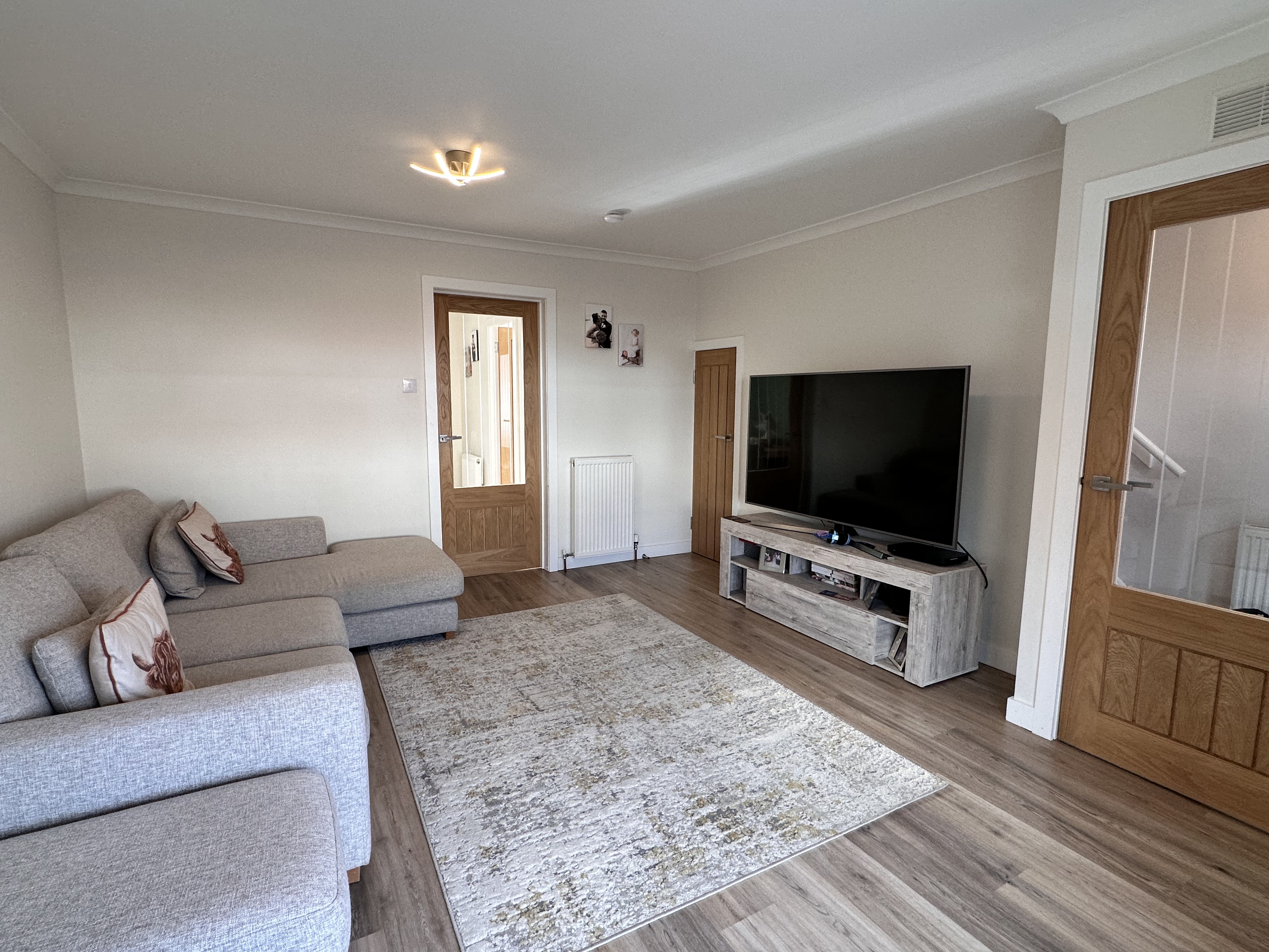 Upon entering, you are welcomed by a bright and airy lounge featuring a bay window formation to the front, allowing natural sunlight to flood the space, complemented by neutral decor and stylish laminate flooring.
