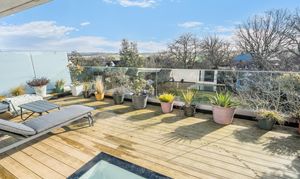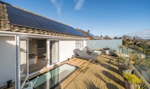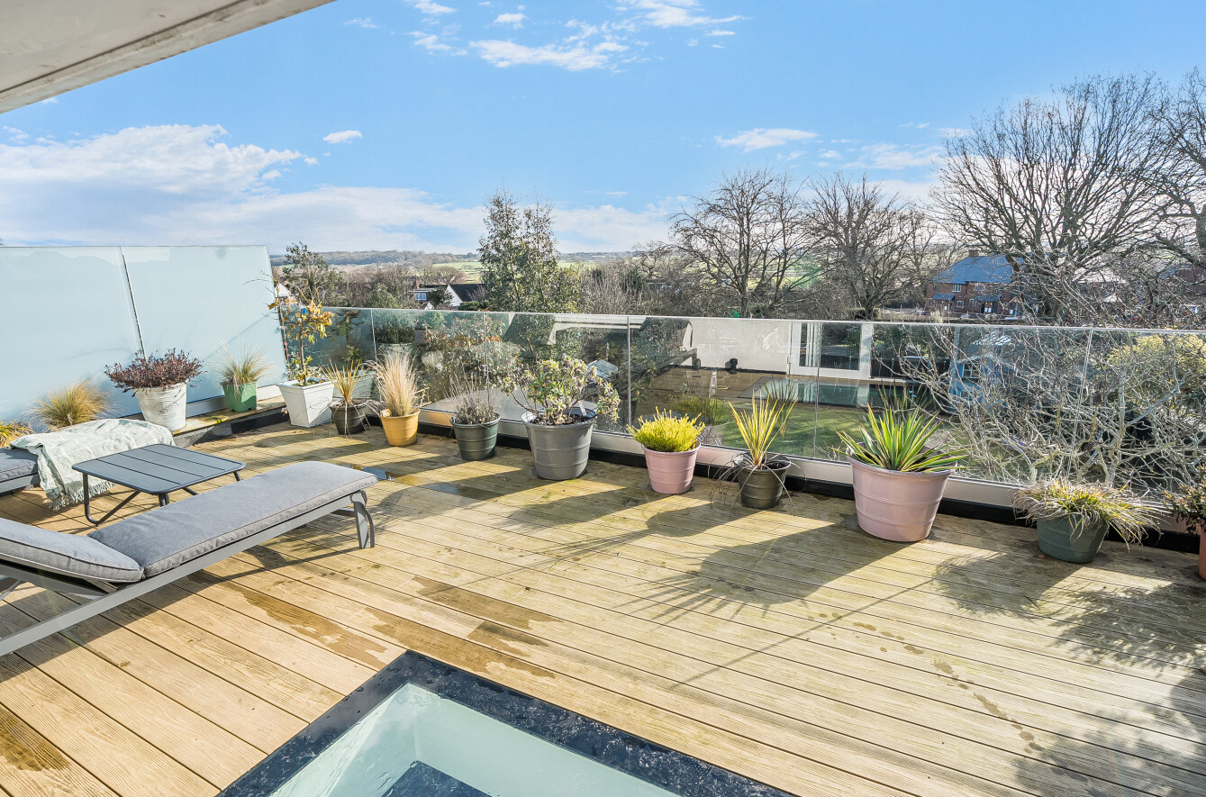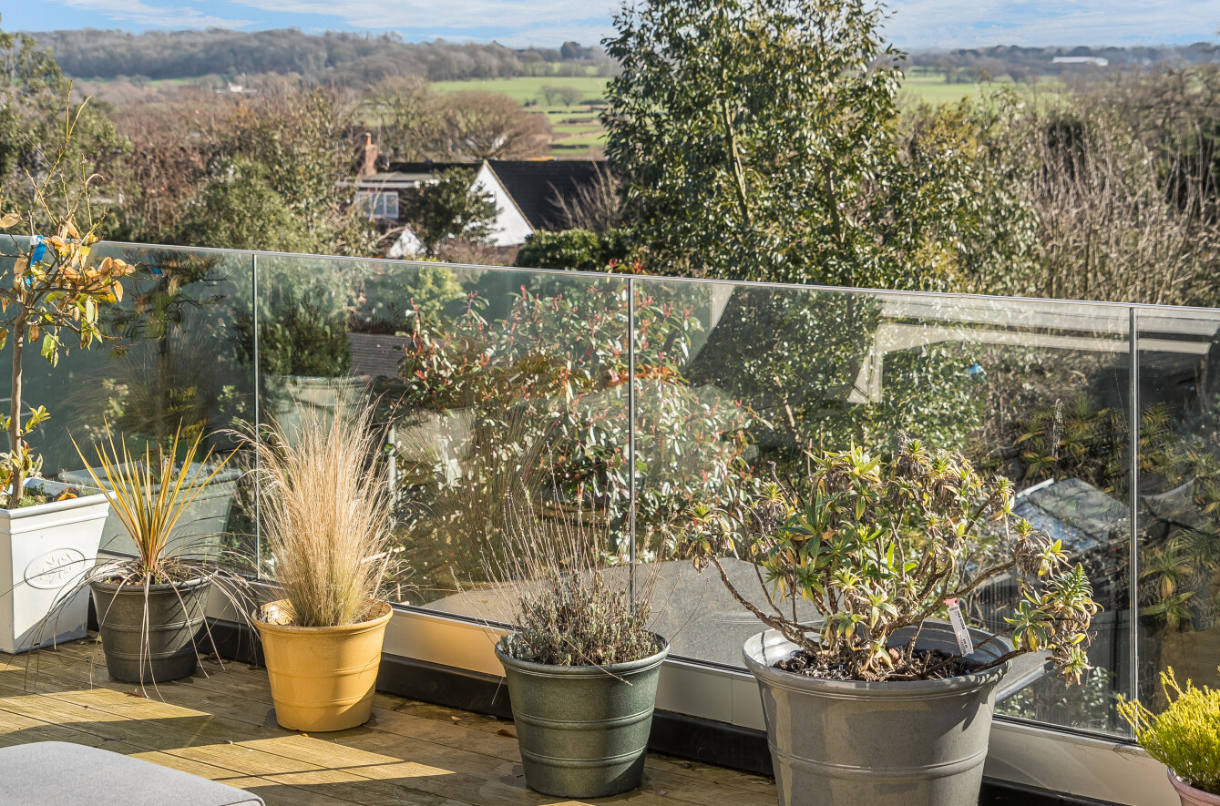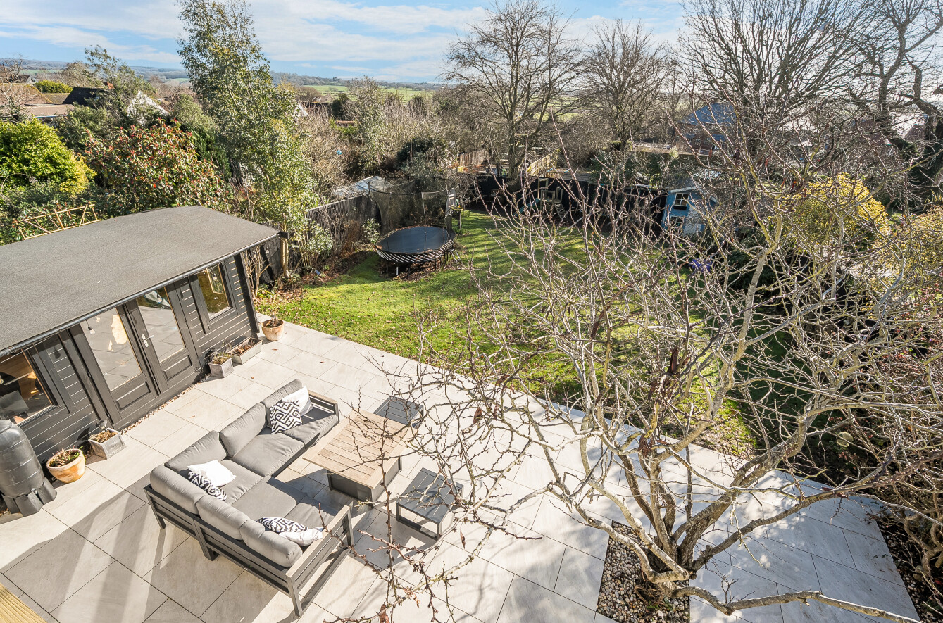 Upstairs, there are four well-proportioned bedrooms served by two luxurious bathrooms with contemporary shower cubicles. Externally, the property continues to impress with a large balcony offering lovely views, a landscaped garden with garden studio, additional garden space, and a private driveway.