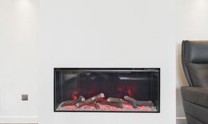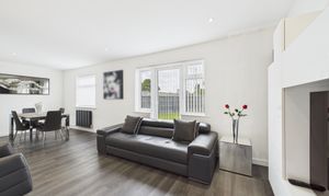 The light-filled lounge diner, spanning an impressive 23'10 x 10'9, provides a versatile space for relaxation and entertainment with a glass fronted fireplace. Reflecting a seamless blend of style and functionality, the double glazed windows flood the interiors with natural light, creating an ambience that is both inviting and elegant.