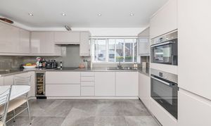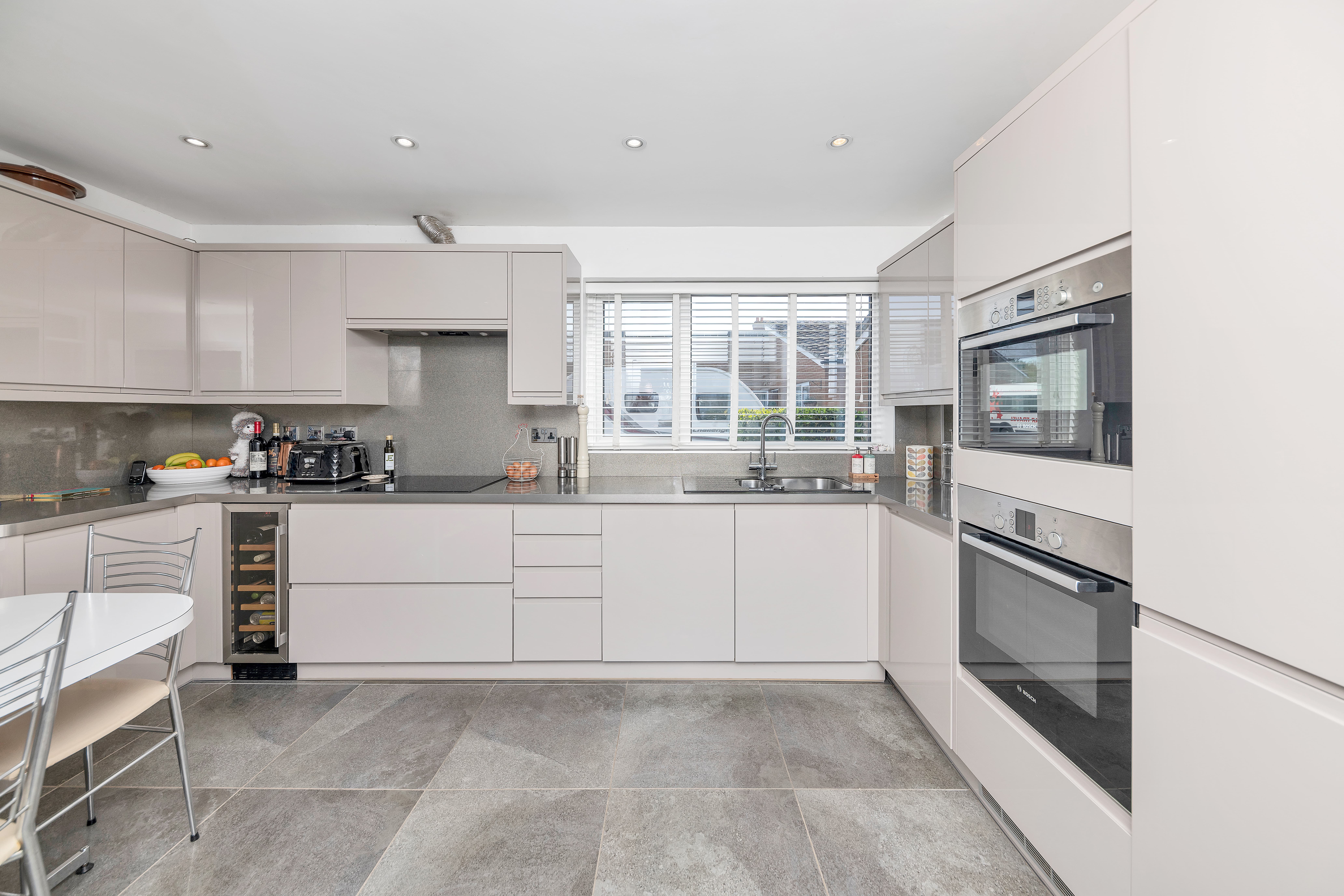 The kitchen has been beautifully designed and decorated, enjoying windows and a door to a dual aspect, a range of gloss base and wall units, tiled flooring, an integrated oven, microwave, hob, extractor hood, fridge/freezer, dishwasher and wine cooler, and space for a breakfast setting and other small kitchen appliances.