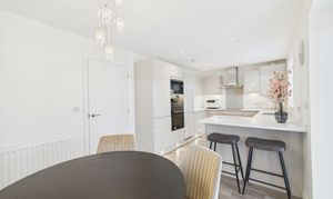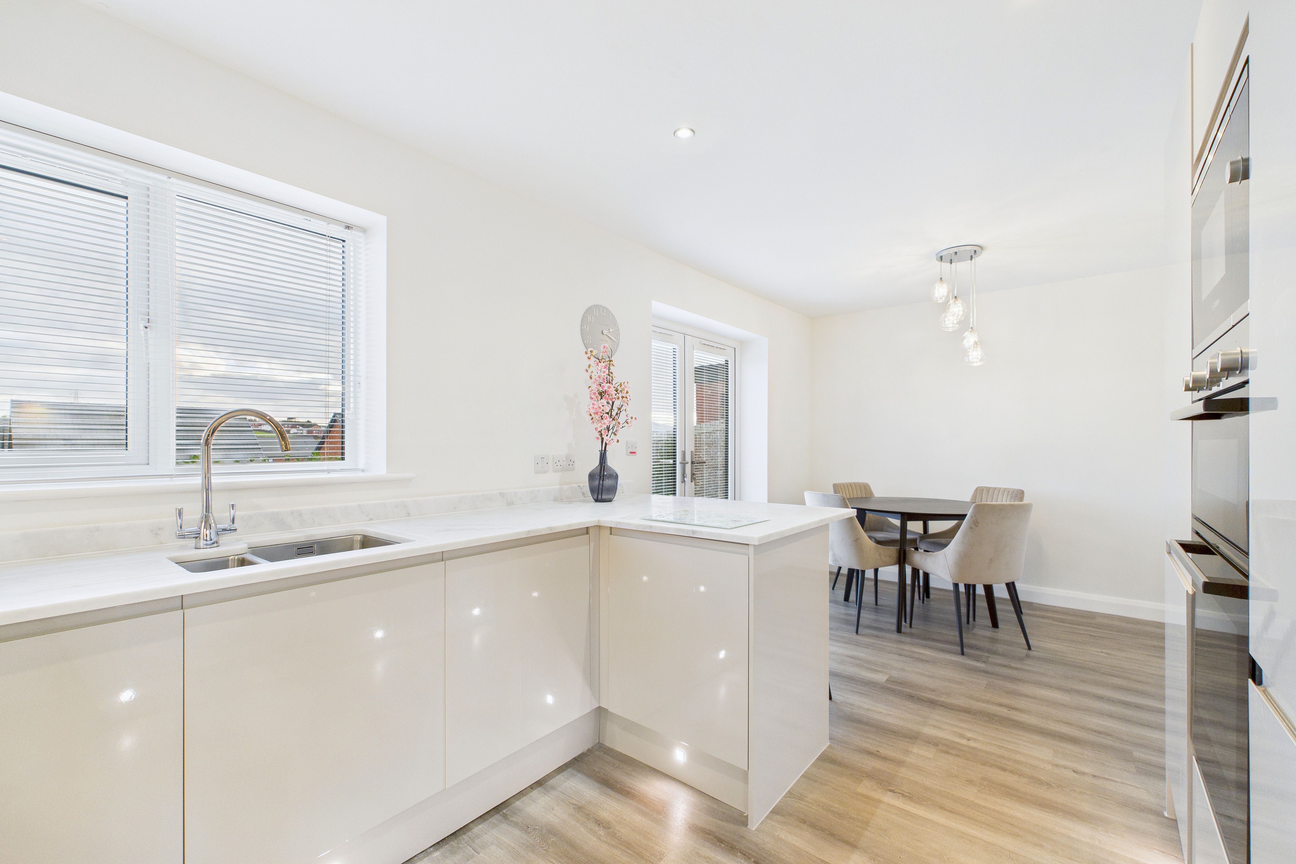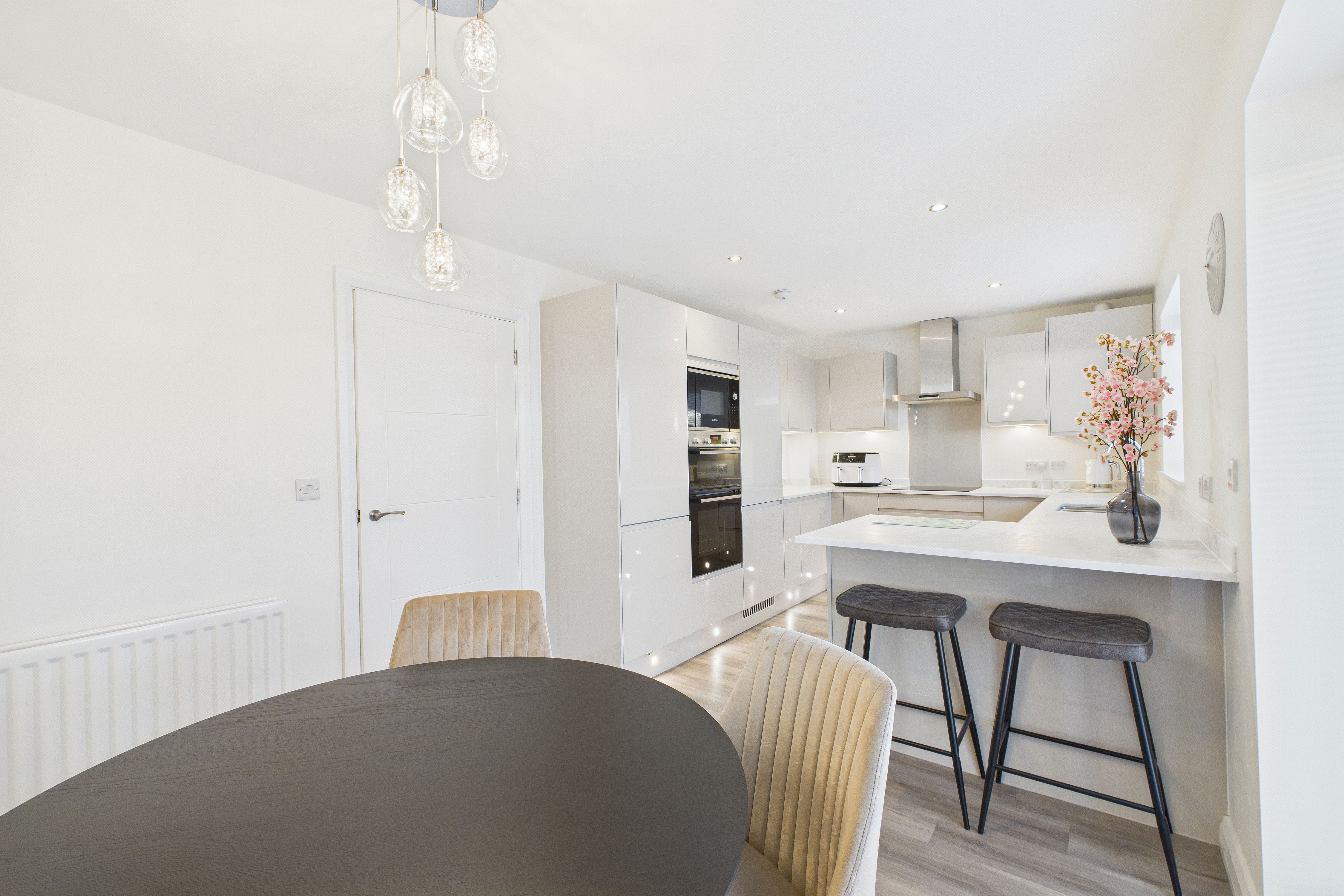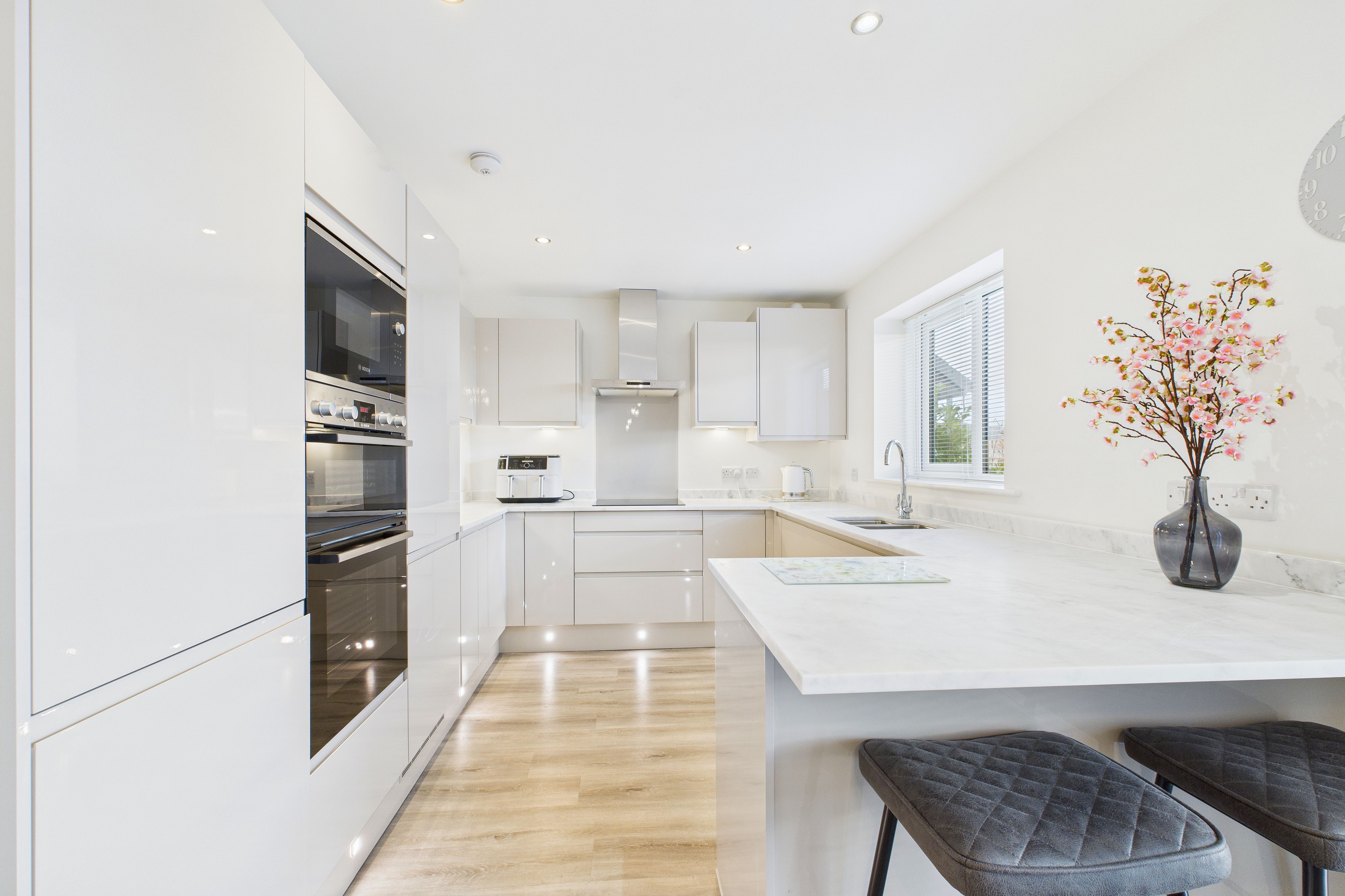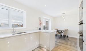 Stepping inside, the welcoming hallway sets the tone for the rest of the property, showcasing the exceptional style and finish that flows throughout. The ground floor seamlessly connects a spacious lounge - complete with attractive wood effect flooring and a contemporary fireplace - to a show-stopping kitchen and dining area. Here, high gloss wall and base units are beautifully complemented by marble work surfaces, while under-cupboard and kickboard lighting add a touch of sophistication. Integrated upgraded Bosch appliances make this kitchen a dream for any home chef, and the open-plan layout is perfect for both family life and entertaining. A convenient ground floor WC completes the downstairs accommodation.