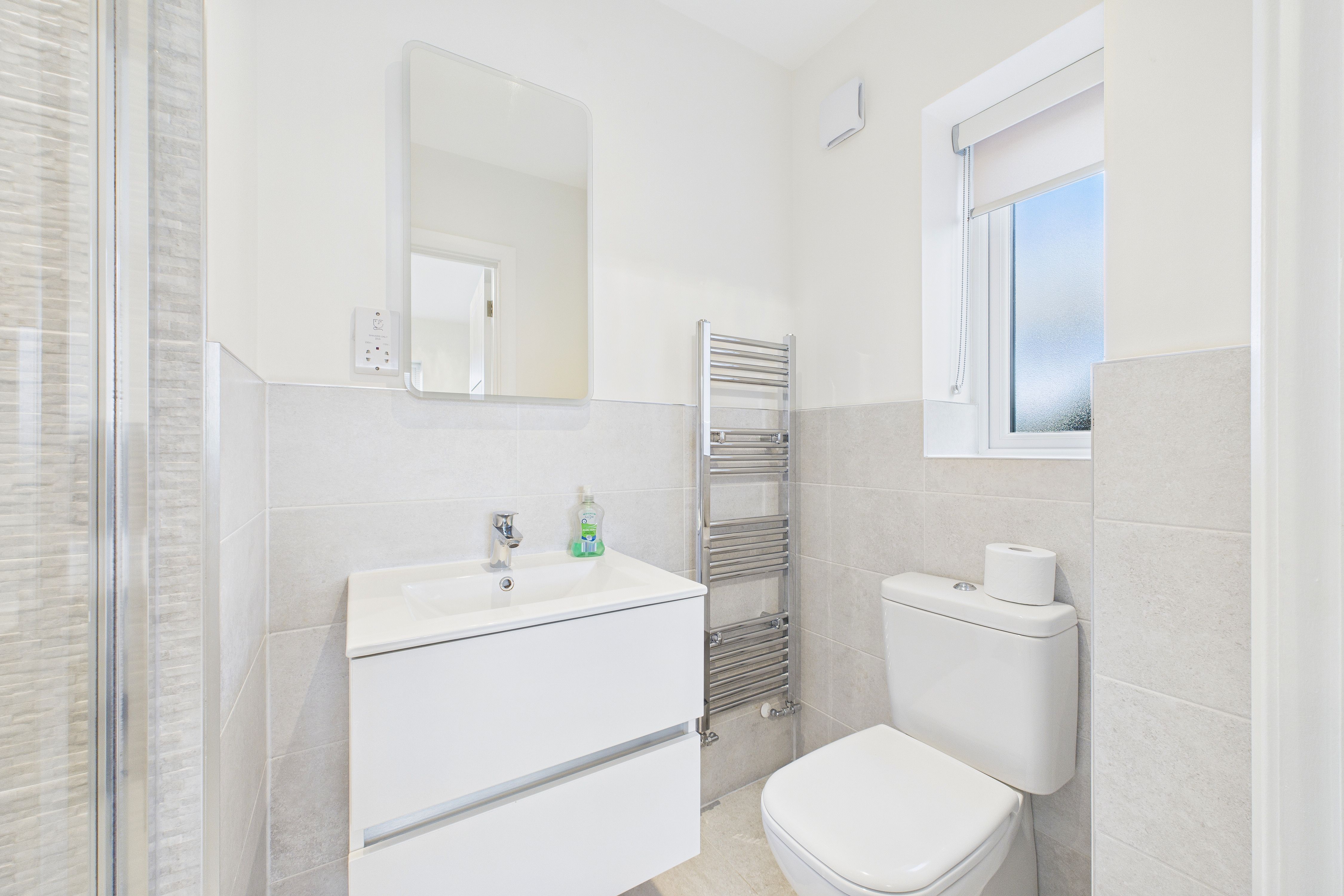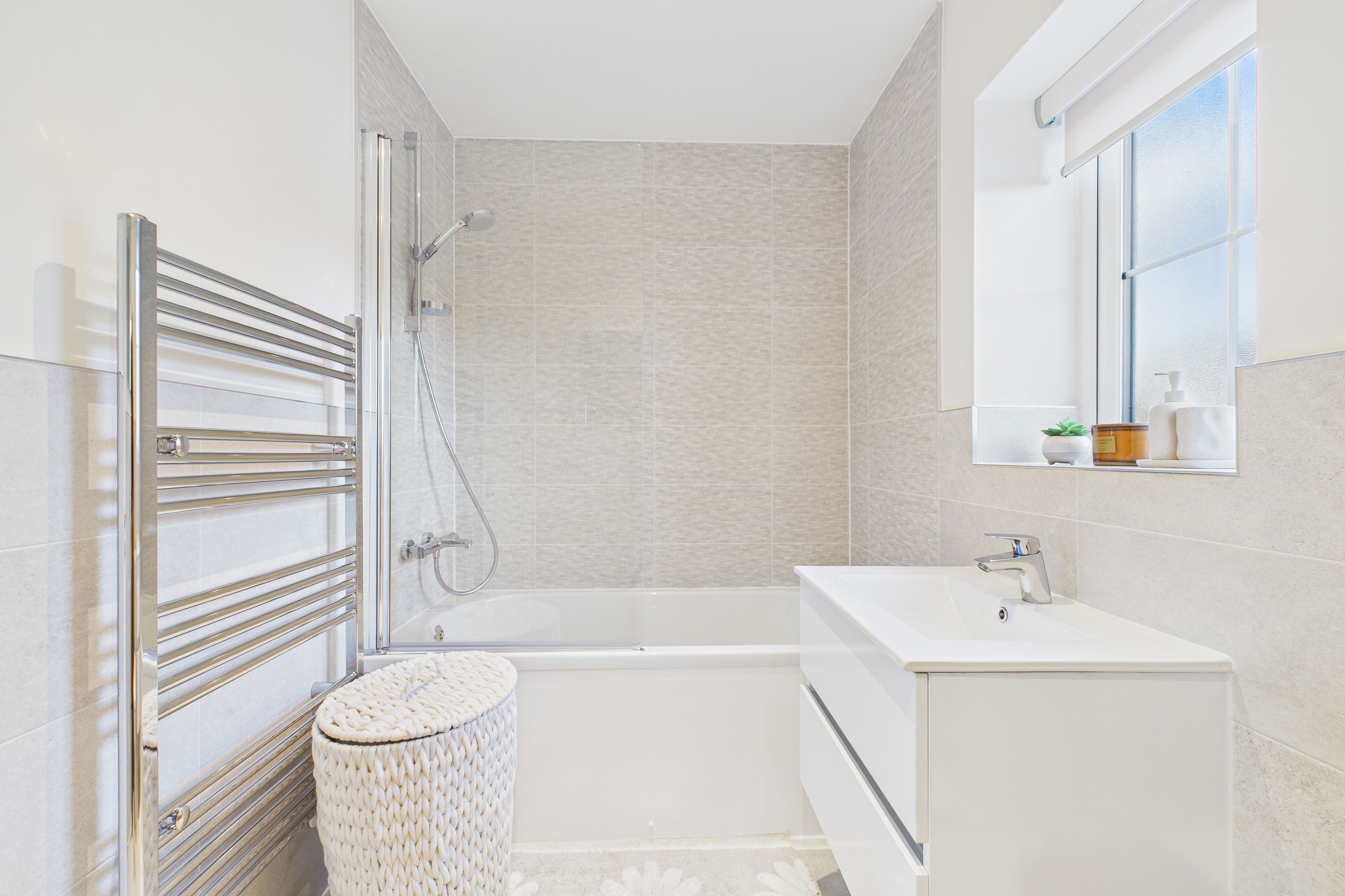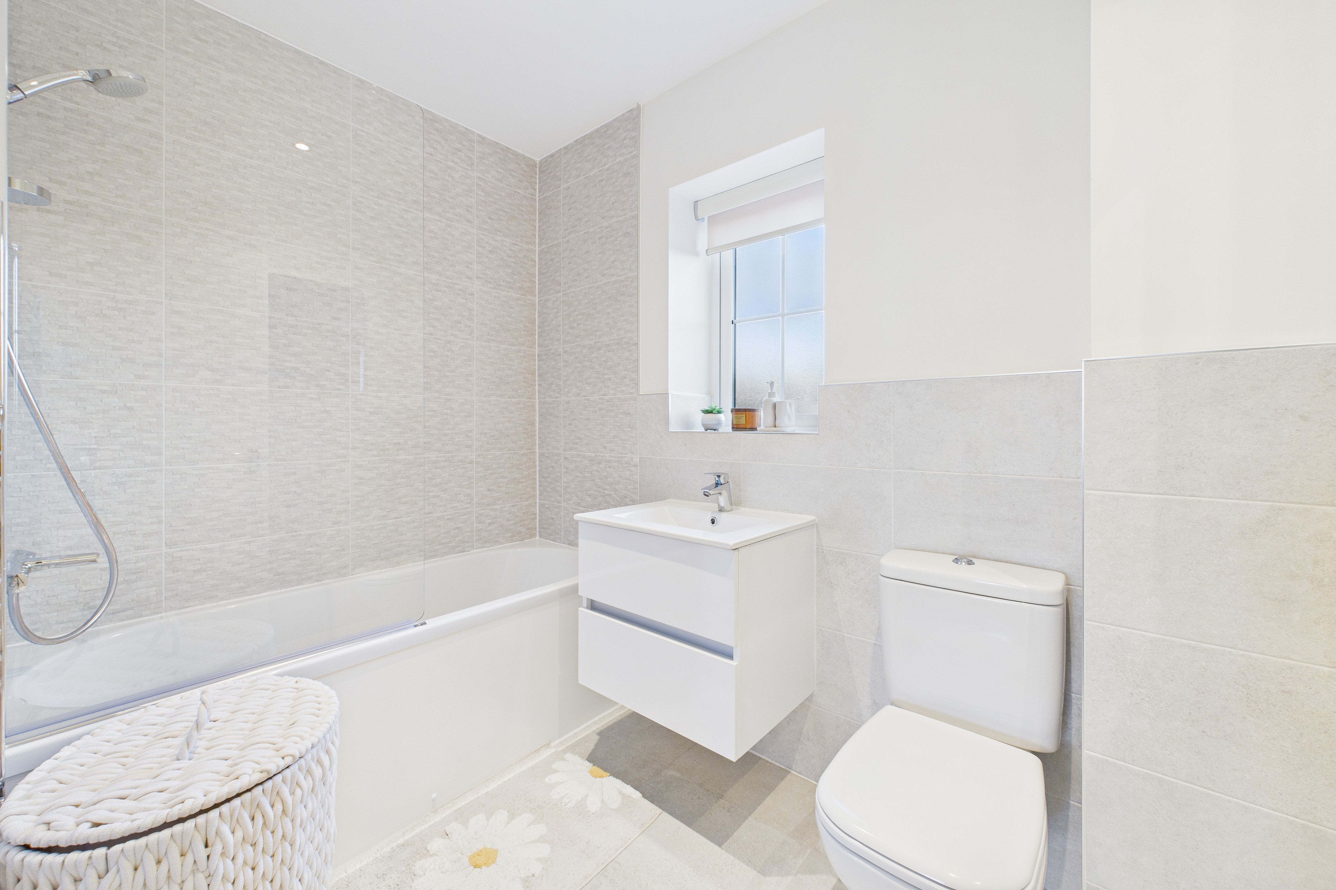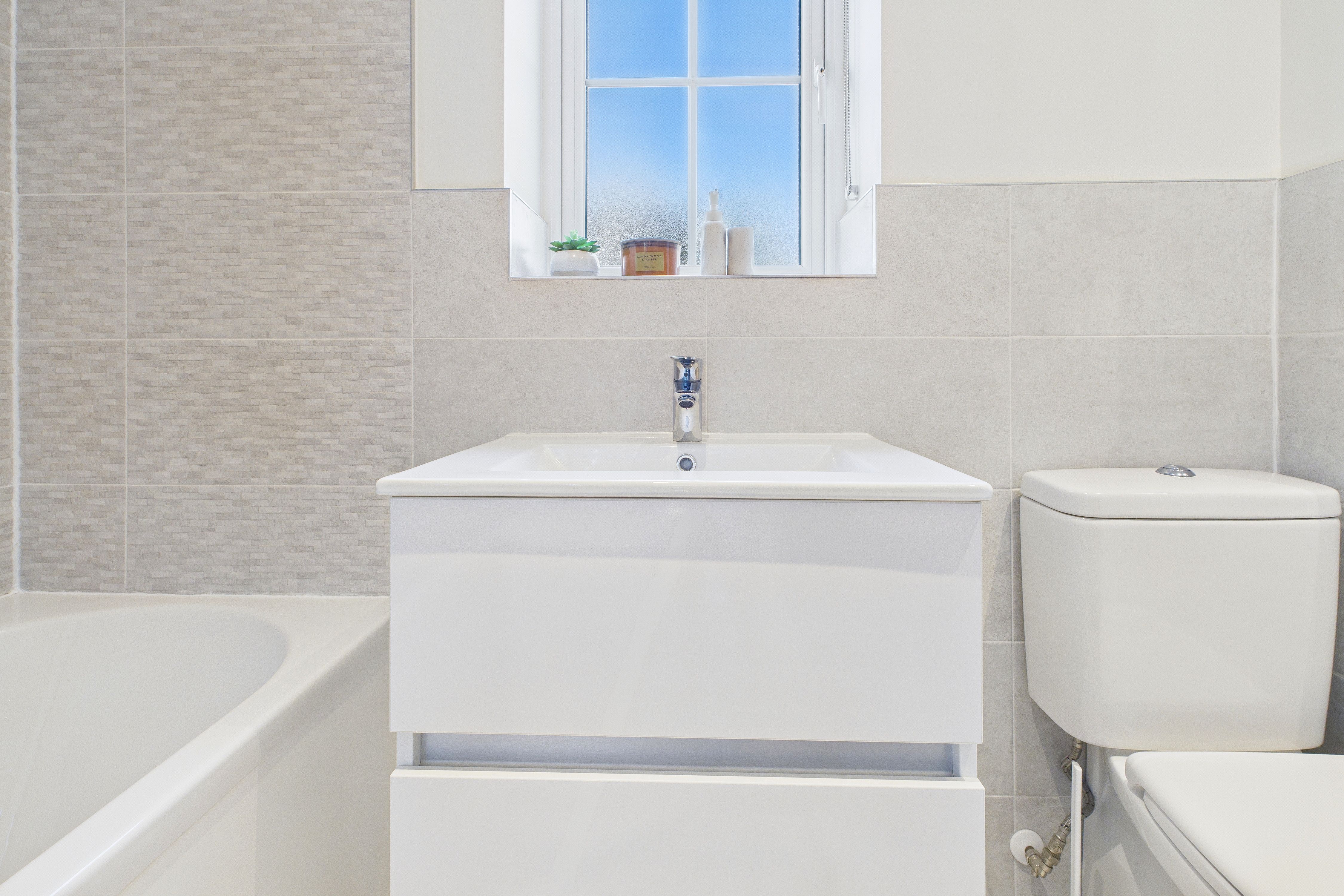 - Modern family bathroom, with wall mounted vanity sink