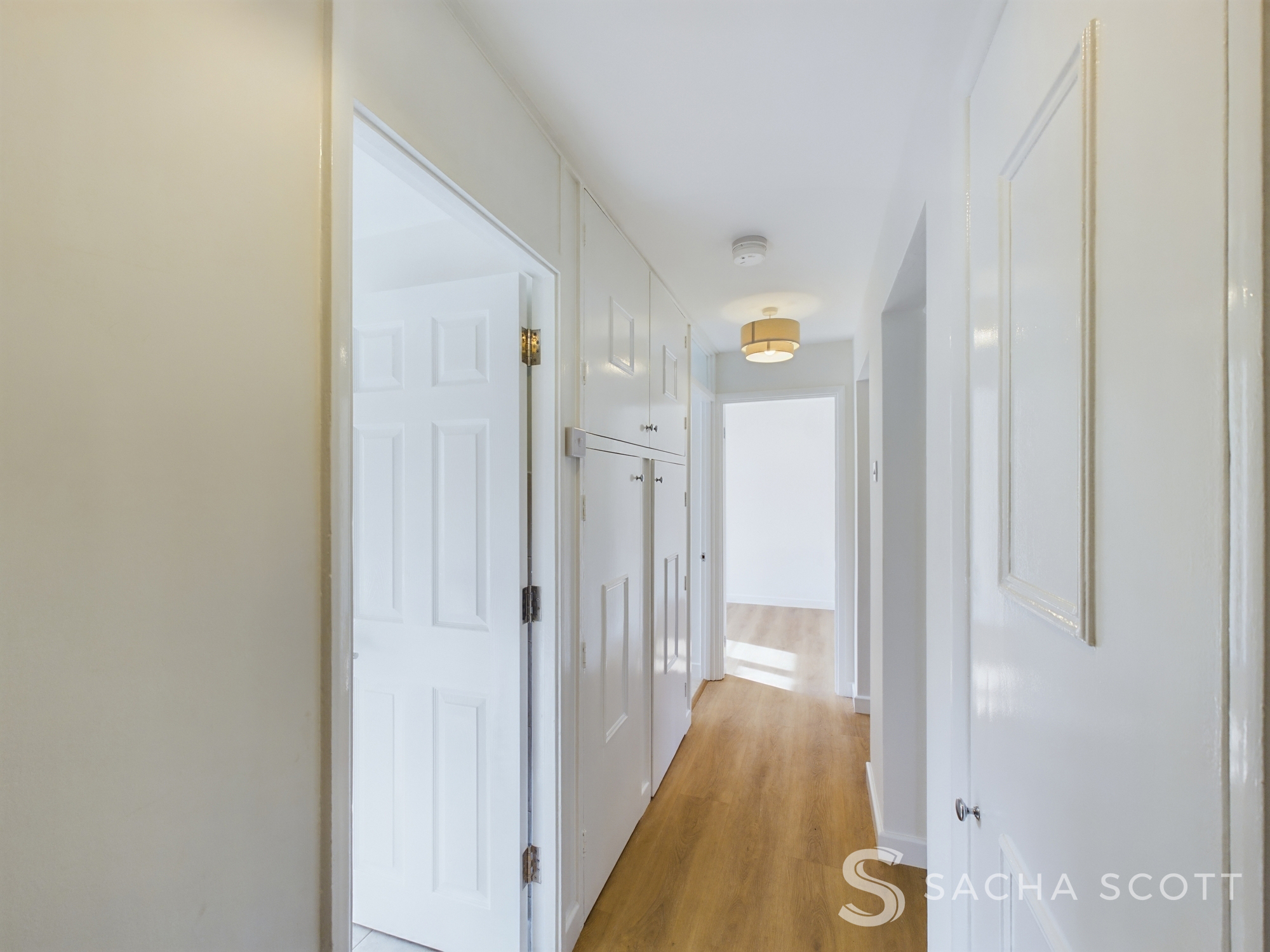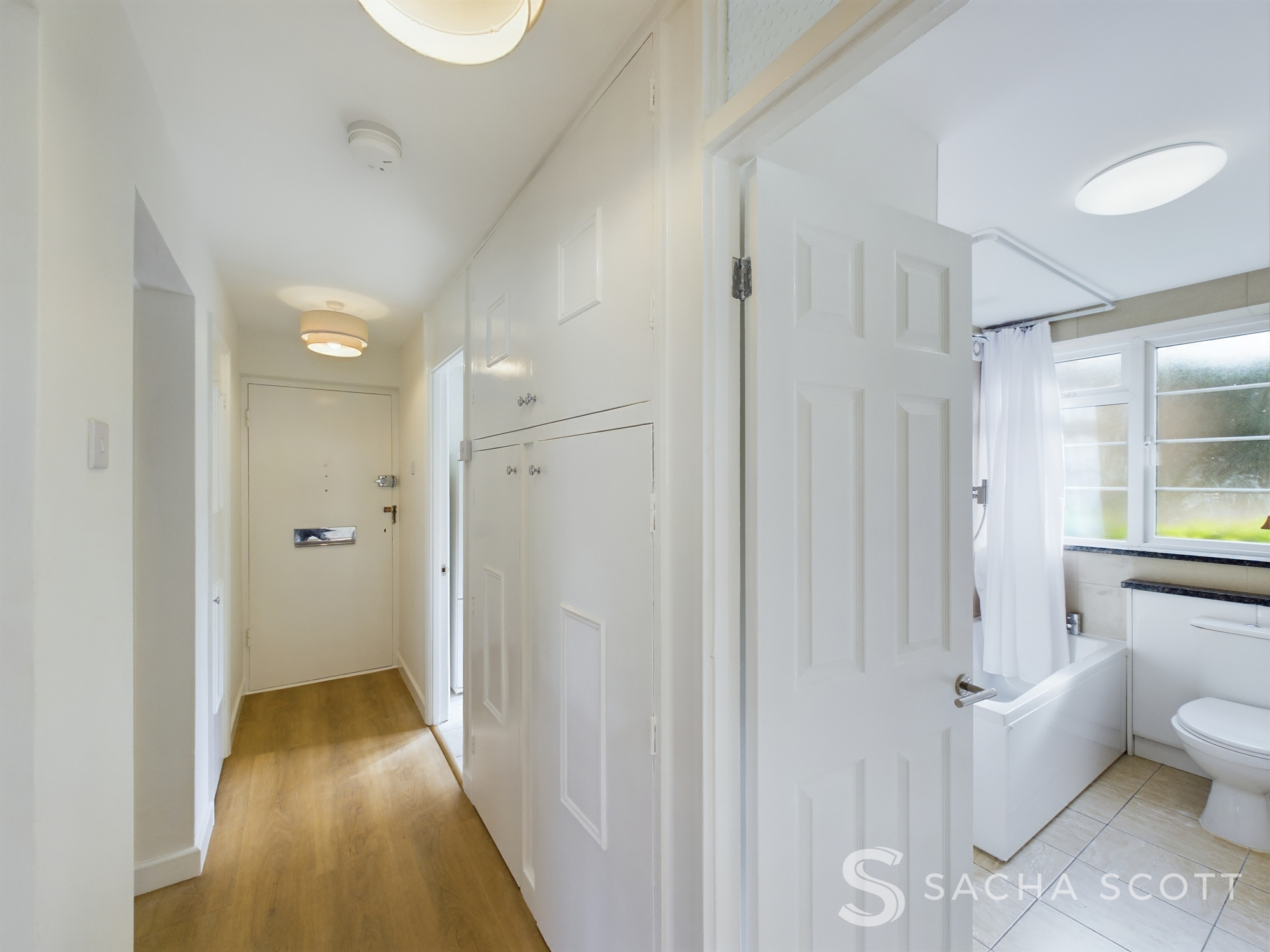 Newly decorated, the entrance hallway benefits from laminate flooring, neutral decor and storage.